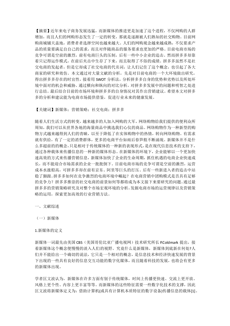 【摘要】近年来电子商务发展迅猛,而新媒体的推进更是加速了这个进程,不仅网购的人群增加,而且人们的网购形态发生了一定的转变,那就是逐渐被人们熟知的社交购物。目前网购商城铺天盖地,消费者者选择空间也越来越大。人们的网购观念越来越成熟,不仅要求产品的质量要满足自自己的需求,而且对伴随商品的服务要求也更加的严格。目前电商市场的竞争可谓是空前的激烈,前有电商巨头的压制,后有一些中小企业的追击。然而拼多多却靠着只记得运作模式,在前后夹击中生存了下来,而且取得了不俗的成绩。拼多多虽然不是社交电商的发起者,但是它却成了社交电商的代名词,让人们记住了这个概念,也引起了各大商家的研究和效仿。本文通过对大量文献的分析,先是对目前电商的一个大环境做出研究,得出拼多多存在的时宜性,接着用SWOT分析法,分析拼多多自身的优势和劣势以及所处环境中面对的机会和威胁。通过横向和纵向的对比分析,对拼多多发展中的问题和明智之处进行总结。最后结合目前的市场环境和拼多多的自身情况对其作出营销建议。希望本文对拼多多的分析和建议能为电商市场提供借鉴,促进行业未来的健康发展。【关键词】新媒体:营销策略:社交电商:拼多多随着人们生活方式的转变,越来越多的人加入网购的大军,网络购物给我们提供的便利众所周知,我们可以从世界各地的海量商品中桃选我们心仪的商品。网络购物作为一种新型的购物方式越来越得到人们的青睐,以至于降低了在实体购物中的热情,转向网络购物。有需求就有供给,有了一定的消费群体,更多的电商平台如雨后春笋般不断涌现。新媒体并不是什么多超前的的概念,只是相对于传统媒体的一种新的表现形式,是在现代信息技术的支持下,通过各种载体来传播信息的一种新的媒体形态。在新媒体的环境下,企业能够以一个更加快速高效的方式来传播营销信息,新媒体加快了企业的生命周期,抓住机遇的电商企业快速成长,而不能迎合市场需求的企业一批批倒下。目前电商市场的竞争可谓是空前的激烈,运营成本水涨船高,可拼多多却在前有京东、阿里等巨头的打压、后有一些新进入者的追击中站稳了脚跟.拼多多如何在竞争激烈的电商环境中崛起?在电商营销中团购模式是否具有足够的竞争力?拼多多推崇的社交电商的前景如何等都将成为本文接下来要研究的问题。通过最拼多多的营销策略研究及对整个市场宏观环境的分析,发掘电商市场的运营规律以及营销策略的运用,深索更加高效的行业营销方法。一、文献综述(一)新媒体1.新媒体的定义新媒体一词最先由美国cBs(美国哥伦比亚广播电视网)技术研究所长P.Coldmark提出,接着新媒体这个概念便慢慢的淡入人们的视野。究竟什么是新媒体,新媒体到底新在何处?人们并不能给出一个确切的说法,它只是一个相对的概念,是信息技术和经济快速发展的背景下出现的一些具有良好的信息交互功能的数字化媒体,而且随着科技的发展,也将会有更多的新媒体出现。学者匡文波认为,新媒体在许多方面有别于传统媒体,时间上传播更快速、交流上更开放、风格上更个性、内容上更丰富等等。而新媒体的这些特征需要一些数字化技术的支撑,因此匡文波将新媒体定义为:借助计算机(或具有计算机本质特征的数字设备)传播信息的载体[1]。通过一些学者和百科对新媒体的介绍,可认为新媒体就是利用一些新的数字技术,借助各种传播媒介来传播信息。我们日常生活中接触到的新媒体也是多种多样,比如各类门户网站、购物网站和论坛,平时使用较多的如QQ、微信、微博和一些新兴的通讯软件之类。在新媒体环境下,信息的传播速度更快,每个个体之间可以实现有效的互动,它在人们之间形成了一个巨大的多方互联的网络。我们可以从这些新媒体当中获取海量的信息,而这些信息会在一定程度上改变我们的生活方式。2.新媒体的特点和分类(1)新媒体信息流通快,辐射范围广,而且具有良好的互动性。比如微博,作为使用者不仅可以浏览信息还可以可以向全世界推送自己的所见所闻所感,而且所有人都可以在每条微博下方随心交流互动,这样既保证了信息的及时性又可以实时互动。微信朋友圈的传播范围也是惊人的,一传十,十传百,每个人的圈子都是不一样,所以信总可以不断地向外辐射,产生病毒式的传播效果。信息的保存时间久,可以根据自我需求随时获取。(2)信息的碎片化。一方面是传统媒介传播市场的份额在不断收缩,其话语权威和传播效能在不断降低:另一方面则是新兴媒介(如博客、BBS等)的勃兴与活跃,传播通路的激增、海量信息的堆积以及表达意见的莫衷一是,这便是现阶段传播力量构建所面对的社会语境(3)媒体内容更加个性化。现在的媒体己经不再像以前那样严肃统一,更多的是一些个性的内容。在人人皆媒的环境下,网络上会出现很多即时的碎片化的信息,而这种碎片化把受众分成了很多群体,不同的群体对信息有着不同的偏好。就是相同的信息也会以各种风格和不同的表达形式来呈现出来,比如一个新闻的发布,我们会看到官方完整的版本,也会看到个人透露出的一些零碎信息,有严肃的风格,也有诙谐幽默的风格。传统的新闻是表述事实,而现在的新闻多多少少会带有一些情感色彩,不光是新闻本身的倾向,更多的是一些评论
