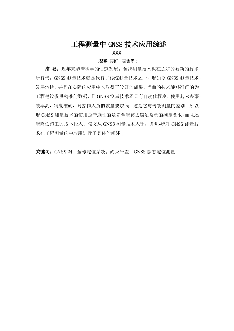 工程测量中GNSS技术应用综述XXX(某系某班,某集团)摘要:近年来随着科学的快速发展,传统测量技术也在逐步的被新的技术所替代,GNSS测量技术就是代替了传统测量技术之一,现如今GNSS测量技术发展较快,并且在实际的应用中也取得了较好的成果,当前的技术能够准确的为工程建设提供精准的数据,且GNSS测量技术还具有自动化程度,使用起来办事效率高,精度准确,对操作人员的数量要求低,这是它与传统测量的差别,所以现GNSS测量技术的使用是普遍性的是完全能够去满足常会的测量要求,而且还能降低施工的成本投入。该文从GNSS测量技术入手,并进-步对GNSS测量技术在工程测量的中应用进行了具体的阐述。关键词:GNSS网:全球定位系统:约束平差;GNSS静态定位测量目录前言…第一章地籍测量技术概述.21.1GNSS测量技术.21.2户外数字测量技术1.3数字摄影测量和遥感技术3第二章GNSS测量技术2.1GNSS测量....................42.1.1GNSS技术的应用2.1.2GNSS技术基站测量.5第三章程测量中GNSS技术的具体应用,3.1在公路测量中的运用现3.2矿山测量方面.3.3GNSS技术在房产测量的应用5总结6致谢7参考文献…8前言导航在人类历史中扮演着一个比较重要的角色,无论是从最初的天文导航(即借助于星象角度实现导航),到中国古代时期发明的司南和指南针,还是近现代时期随着航海技术发展而出现的六分仪、陀螺仪,到无线电导航等,其本质都在于如何在不能明确自身位置的情况下通过外界的手段来找回位置,但是由于使用条件的限制以及现代高科技技术的发展,古老的导航工具显然已经不能够适应现在的需求。20世纪20-30年代,从航海和航空领域的无线电导航发展开始,以及雷达导航的相继出现,证明了地理信息开始对导航发展越发重要,再到人造地球卫星的成功发射,使得卫星导航的出现以及发展成为了必然趋势。现代全球卫星导航系统(Global Navigation Satellite System,简称GNSS)是全球利用卫星实现导航定位功能的系统的总称,目前为止,做到覆盖全球的卫星导航定位系统主要有四个,分别是美国的GPS,欧盟的Galileo,俄罗斯的GLONASS以及中国的BDS,除此之外还包含着区域性地基和空基增强系统,如美国的广域增强系统(Wide AreaAugmentation System,简称WAAS),日本的准天顶卫星系统(Quasi-ZenithSatellite System,简称QZSS)和欧盟的欧洲近地导航重叠系统(EuropeanGeostationary Navigation Overlay System,简称EGNOS)等。姿态测量作为一种广泛应用于航空、航海及雷达测量等领域的一种技术,在卫星导航系统技术不断发展并日趋成熟之后得到了更加广泛的关注。在GPS出现之前,更加早期的姿态测量技术主要依靠惯性导航系统(Inertial NavigationSystem,简称NS)进行实现,通过传感器的惯性特性来求取并反映载体的位置、速度以及姿态等信息,主要包括一些陀螺仪和加速度计,但由于只受到传感器本身的物理特性的影响,具有完全的隐蔽性和自主性,因而获得的姿态信息的精度比较高,适用范围也比较广,但是由于该系统导航信号在时间上具有连续性,使得其最为突出的问题就是误差会随着时间进行积累,直接影响姿态测量信息的持续精度,并且考虑到惯性器件本身一般体积较大、结构复杂、造价高昂、初始化及后续操作处理比较复杂,因而在原有的基础上想要再提高姿态测量的精度比较复杂。近年来,随着GNSS技术的发展以及载波相位差分技术的解算精度的提高,
