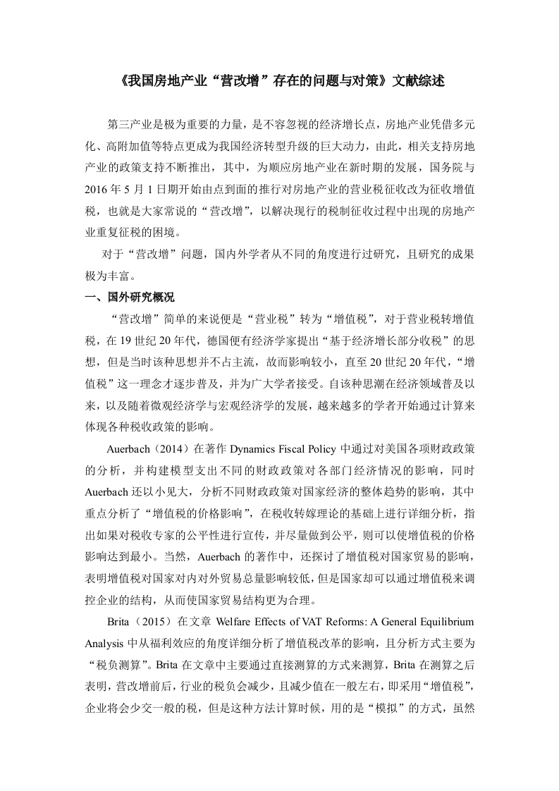 《我国房地产业“营改增”存在的问题与对策》文献综述第三产业是极为重要的力量,是不容忽视的经济增长点,房地产业凭借多元化、高附加值等特点更成为我国经济转型升级的巨大动力,由此,相关支持房地产业的政策支持不断推出,其中,为顺应房地产业在新时期的发展,国务院与2016年5月1日期开始由点到面的推行对房地产业的营业税征收改为征收增值税,也就是大家常说的“营改增”,以解决现行的税制征收过程中出现的房地产业重复征税的困境。对于“营改增”问题,国内外学者从不同的角度进行过研究,且研究的成果极为丰富。一、国外研究概况“营改增”简单的来说便是“营业税”转为“增值税”,对于营业税转增值税,在19世纪20年代,德国便有经济学家提出“基于经济增长部分收税”的思想,但是当时该种思想并不占主流,故而影响较小,直至20世纪20年代,“增值税”这一理念才逐步普及,并为广大学者接受。自该种思潮在经济领域普及以来,以及随着微观经济学与宏观经济学的发展,越来越多的学者开始通过计算来体现各种税收政策的影响。Auerbach(20l4)在著作Dynamics Fiscal Policy中通过对美国各项财政政策的分析,并构建模型支出不同的财政政策对各部门经济情况的影响,同时Auerbach还以小见大,分析不同财政政策对国家经济的整体趋势的影响,其中重点分析了“增值税的价格影响”,在税收转嫁理论的基础上进行详细分析,指出如果对税收专家的公平性进行宣传,并尽量做到公平,则可以使增值税的价格影响达到最小。当然,Auerbach的著作中,还探讨了增值税对国家贸易的影响,表明增值税对国家对内对外贸易总量影响较低,但是国家却可以通过增值税来调控企业的结构,从而使国家贸易结构更为合理。Brita (2015)Welfare Effects of VAT Reforms:A General EquilibriumAnalysis中从福利效应的角度详细分析了增值税改革的影响,且分析方式主要为“税负测算”。Bita在文章中主要通过直接测算的方式来测算,Bita在测算之后表明,营改增前后,行业的税负会减少,且减少值在一般左右,即采用“增值税”,企业将会少交一般的税,但是这种方法计算时候,用的是“模拟”的方式,虽然对整体行业的情况有一定的研究价值,但是对单一的企业的不同阶段的税负情况,参考价值较小。在文章中,Bita也提出了一般均衡模型方式来计算行业税负,这种方式较为复杂,Bita并没有在文章中进行计算分析,但是他这一思路为其他学者提供了研究思路。Chamley(20l6)在文章Optimal Taxation of Capital Income in GeneralEquilibirum with Infinite Lives中提出了“最有税收”的理念,并且表明,“营改增”这一方式是“最优税收”的一种实验形式,虽然该种税收方式可以在很大程度上降低企业的负担,有利于产业结构的调整,但是由于各个行业的不同,经营方式等的不同,“增值税”若是单一的“一刀切”,使所有行业均按照某一特定的税收模式,则并不会利于全部行业的发展,并且,“营改增”的步子应当尽量小,有一个“缓冲地带”,这样才能尽可能的促进产业的发展,且达到“最优税收”。二、国内研究概祝我国正式实行“营改增”政策在2012年1月1日,从实行“营改增”到现在,尚不足六年,故而我国学者对“营改增”的研究时间较短,但研究成果仍然很丰富。刘中虎(2013)在其文章中对增值税的社会经济效应进行了分析,指出增值税可能会导致地方财政收入减少,同时对产业结构、行业结构等角度出发,表明增值税的转型需要建立在较佳的产业结构以及行业结构之上,如果经济结构本身较为失调,那么退出增值税必然会对企业有较大的负面影响。另外,刘中虎还对“营改增”中可能存在的问题进行分析,并以房地产行业进行论证,表明在当前我国房地产发展过热的情况下,过快的推行“营改增”,在政策初期,房地产行业可能会面临较大的损失,故而国家在房地产行业推行“营改增”政策时,需制定一些过渡措施,以降低对房地产行业的消极影响。宫庆翠(2015)在其论文中对“营改增”的影响、问题以及对策进行分析,采用的方式主要为实证分析,其分析主要建立在“现代经济增长理论”模型之上,宫庆翠的文章中,将增值对转型对我国第一、第二、第三产业中的部分行业的影响进行了分析,表明增值税转型将会使我国的产业结构发生变化。对于“营改增”的问题,如制度设计不够合理、价格难以控制、财政承受能力不足等,宫庆翠是从宏观角度进行分析的,而对于问题的解决措施,宫庆翠的意见与建议相对来说,对单一企业的指导作用较小,也是从宏观角度来进行描述的,如立法推进、机构协调等。蔡文文(2016)对“营改增”的研究相对来说范围比较小,蔡文文主要是从建筑企业出发,分析“营改增”对建筑企业的影响,且其研究中重点以L企业为例,通过数据的计算等来进行分析,不过由于建筑业纳入“营改增”范围的时间较短,所以蔡文文的研究数据并不能得到证实。另外,蔡文文的研究只是针对L企业,故而其研究并不具备概括性,不过可以给一些类似企业提供一定的参考。房地产行业是建筑业的“下游”部分,且当前我国房地产业与建筑业之间的抵扣项目并不够明确,故而“营改增”的复杂性以及难度会进一步提升。三、国内外研究评述综合国内外研究情况,可以看出,国外对“营改增”的研究多集中在“营改增”的税负测算、行业影响等方面,国