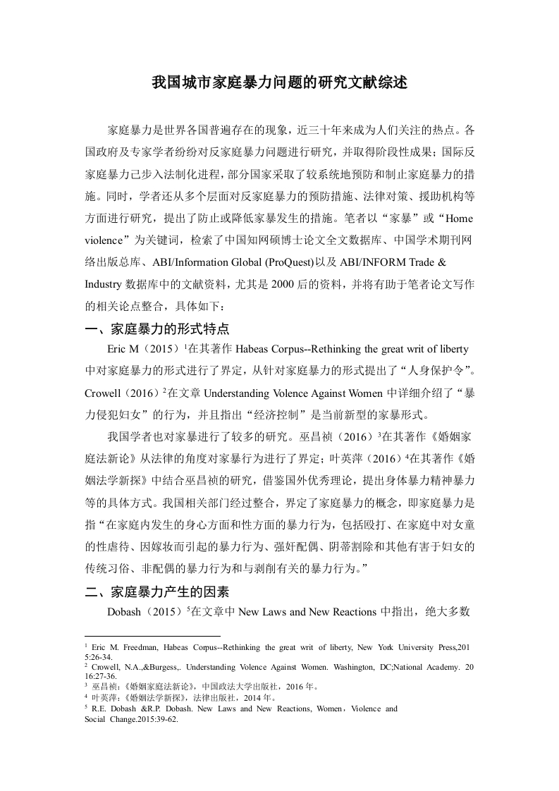 我国城市家庭暴力问题的研究文献综述家庭暴力是世界各国普遍存在的现象,近三十年来成为人们关注的热点。各国政府及专家学者纷纷对反家庭暴力问题进行研究,并取得阶段性成果:国际反家庭暴力己步入法制化进程,部分国家采取了较系统地预防和制止家庭暴力的措施。同时,学者还从多个层面对反家庭暴力的预防措施、法律对策、援助机构等方面进行研究,提出了防止或降低家暴发生的措施。笔者以“家暴”或“Homeviolence”为关键词,检索了中国知网硕博士论文全文数据库、中国学术期刊网Industry数据库中的文献资料,尤其是2000后的资料,并将有助于笔者论文写作的相关论点整合,具体如下:一、家庭暴力的形式特点Eric M(20l5)l在其著作Habeas Corpus--Rethinking the great writ of liberty中对家庭暴力的形式进行了界定,从针对家庭暴力的形式提出了“人身保护令”。Crowell(20l6)2在文章Understanding Volence Against Women中详细介绍了“暴力侵犯妇女”的行为,并且指出“经济控制”是当前新型的家暴形式。我国学者也对家暴进行了较多的研究。巫昌祯(2016)3在其著作《婚姻家庭法新论》从法律的角度对家暴行为进行了界定:叶英萍(2016)4在其著作《婚姻法学新探》中结合巫昌祯的研究,借鉴国外优秀理论,提出身体暴力精神暴力等的具体方式。我国相关部门经过整合,界定了家庭暴力的概念,即家庭暴力是指“在家庭内发生的身心方面和性方面的暴力行为,包括殴打、在家庭中对女童的性虐待、因嫁妆而引起的暴力行为、强奸配偶、阴蒂割除和其他有害于妇女的传统习俗、非配偶的暴力行为和与剥削有关的暴力行为。”二、家庭暴力产生的因素Dobash(20l5)5在文章中New Laws and New Reactions中指出,绝大多数Eric M.Freedman,Habeas Corpus--Rethinking the great writ of liberty,New York University Press,2015:26-34.2 Crowell,N.A.,&Burgess,.Understanding Volence Against Women.Washington,DC;National Academy.2016:27-36.3巫昌祯:《婚烟家庭法新论》,中国政法大学出版社,2016年。4叶英萍:《婚姻法学新探》,法律出版社,2014年。3 R.E.Dobash &R.P.Dobash.New Laws and New Reactions,Women,Violence andSocial Change.2015:39-62.妇女的经济地位不如男子,这是造成两性关系失衡的重要因素。由于多数男子较女子在经济上更占优势,妇女也就颇能接受丈夫享有行使暴力的权利。而且,如果受虐妇女没有独立的经济来源,其对于离开施暴者的前景可能感到焦虑与怀疑,欠缺选择权、谋生技能与财力使其害怕尝试逃离施暴者。Tamara(2017)6在其Exploring the Bounds of Judicial Intervention in The Lives of DomesticViolence Victims中也表明,社会的漠视是家庭暴力频繁发生的间接原因。多年来,对家庭暴力问题,社会认识不清,重视不够。长期以来,家庭暴力问题被视为家务事,少有人问津。许多部门和组织对家庭暴力事件往往视而不见或轻描淡写,最具代表性的就是部分司法部门不愿介入家庭纷争,认为家庭有其隐私而不宜有公权力介入,这必然将受害者置于更不利的境地。我国学者对家暴产生因素的分析多是从我国历史等因素分析的。孙彬(2014)7的《婚姻家庭法学》指出法律法规不健全,援助机制不完善。我国现行法律法规不健全,对家庭暴力制止不力是目前家庭暴力案件增多的重要原因。陶春芳(2015)8则在文章《中国妇女社会地位概况》中指出受男尊女卑、夫权统治余毒的影响,漠视人权。在以男性为中心的旧中国的宗法制度下,妇女成为男子的附属物:而且,“夫为妻纲”是旧中国夫妻关系立法的指导思想,丈夫集家长权、夫权、父权于一身,夫妻之间是统治与被统治的关系,丈夫享有对妻子行使暴力的权利,是理所当然的。这种思想是造成家庭暴力的又一成因。三、防止家暴的措施Rebecca Probert(2016)9在文章Cretney's Family Law中从法律的角度提出了防止家暴的措施,并且表示,保护令制度可以更好的保护独女权益。尤其是保护令制度在英美法系国家中存在已久,它适用于多种类型的案件,对家暴案件也有极大的好处。Hary(2016)1o在文章Family Law中也是多从法律的角度出发,且以英国为例,指出虽然,近十年英国曾经出现过大量处理家庭暴力问题的政策和模式,但是,不少政策和模式只在短期内取得很小的成功,反家庭暴力仍有很6 Tamara L.Kuennen Civil Protection Orders:Exploring the Bounds ofJudicial Intervention in The Lives of Domestic Violence Victims.Cucla Women's Law Journal,2017.66-6了孙彬,姬新江:《婚姻家庭法学》,中国人民公安大学出版社,2014年。。陶春芳:《中国妇女社会地位概况》,中国妇女出版社2015年。Rebecca Probert,Cretney's Family Law,Fifth Edition.Sweet&Maxwell.2003 The Ministry of Justice,D长的路要走。我国学者在反家暴方面也进行了较多的研究。林玉琼(2015)"在文章《浅谈家庭暴力学》中对家暴产生原因等进行分析后,针对具体的原因还提出了具体的防治对策。巫昌祯(2015)2在其文章《防治家庭暴力研究》中也从我国的国情出发,从司法角度、政治情况以及其他救助机构等的角度分别提出了防家暴的措施。在该文中,也对各种保护令进行的具体分析,对申请人可申请保护的条件也进行了细化,如“禁止被申请人殴打、威胁受害人或受害人的亲友、禁止被申请人骚扰、跟踪受害人,或与受害人进行不受欢迎的接触以及责令有必要且具备条件的被申请人暂时搬出家庭成员共同的住处”等。总而言之,家暴问题产生的不良影响较为严重,国内外均