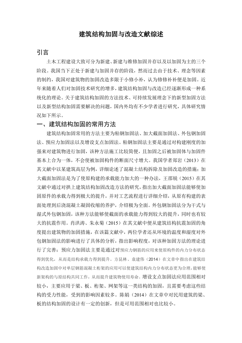 建筑结构加固与改造文献综述引言土木工程建设大致可分为新建、新建与维修加固并存以及以加固为主的三个阶段。我国当下正处于新建与加固并存的阶段,然而过去由于技术、理念等因素的制约,我国对建筑物的加固改造多限于小修小补,认为修修补补便是加固。近年来随着人们对加固技术研究的增多,建筑结构加固与改造已经逐渐形成一种系统化的理论。关于建筑结构加固的方法技术、可持续发展理念下的新型加固方法以及新型结构加固需要解决的问题,国内外均有不少学者进行研究,具体研究情况如下所示。一、建筑结构加固的常用方法建筑结构加固常用的方法主要为粘钢加固法、加大截面加固法、外包钢加固法、预应力加固法以及增设支点加固法。粘钢加固法主要是通过对构建刚度的加强来对建筑物进行加固,该种方法施工比较简便,且加固之后被加固体与加固件基本上合为一体,不会使被加固构件的断面尺寸增大。我国学者郑岩(2013)在其文献中以某建筑高层为例,详细论述了混凝土结构拆除及加固改造的措施:加大截面加固法是为了使原构建的承载能力加大的一种办法,王邵锐(2015)在其文献中通过对拱上建筑结构加固改造方法的研究,指出加大截面加固法能够使加固原件的承载力得到极大的提升,并对工艺流程进行详细介绍,从原有构建的表面处理到后浇混凝土凝固收缩的养护,介绍极为全面。外包钢加固法分为干式与湿式外包钢加固,该种方法能够使截面的承载能力得到较大的提升,同时也有较大的抗震作用。肖洪涛、朱永菊(2015)在其文献中便从建筑结构抗震加固的角度提出建筑物的加固措施,在该篇文献中,两位学者还从环境的温度和湿度对外包钢加固法的影响进行了具体的分析,指出影响程度,对该种加固方法的理论进行了完善:预应力加固法主要是通过对预应力钢筋的应用来使原构件的内力分布状态得到优化,从而是结构承载力得到提升。方昆林、袁建伟(2014)在文章中指出在建筑结构改造加固中对单层钢筋混凝土桁架的应用可以使建筑结构内力分布状态更为合理,能够使新架构的与原结构共同工作,从而提升建筑物使用寿命。增设支点加固法应用范围相对较小,主要应用于梁、板、桁架、网架等这一类结构的加固,且需要考虑这些结构的受力性能,受到的影响因素较多。陈娟(2014)在文章中对民用建筑的梁、板的结构加固的设计有一定的创新,但是可用范围相对也比较小。关于传统的建筑结构加固方法的研究,美国学者Mark I.Sarkisian(20l4)在其文章Design of environmentally responsible structures in regions of high seismicsk中进行了全面的总结,并且以高地震区建筑结构加固为例,对传统的建筑结构方法进行整合,提出了环境友好型结构的设计。由于当前美国等发达国家已经进入了以加固为主的阶段,故而关于传统的建筑结构加固方法的研究偏少,较多的是关于新型加固方法的研究。二、新型加固方法的相关研究随着可持续发展理念的深入人心,越来越多的学者探究新型加固方法,以促进自然与人的和谐发展。关于新型加固方法,主要有粘贴碳纤维加固法、加大截面加固法、置换混凝土加固法、有粘结外包型钢加固法以及粘贴钢板加固法五种。粘贴碳纤维加固法是对粘钢加固法的一种创新,该种方法是将用胶粘剂将碳纤维材料进行固化,在其固化之后便能在原固件的表面形成一种复合层,该复合层对原有固件的的稳定性有重要的作用。我国对于粘贴碳纤维加固法较为全面的研究是惠军民(2013)对纤维布包裹加固钢筋混凝土柱的轴心受压试验研究,在该试验中,惠军民提出了一种简化计算公式,主要是玻璃纤维布包裹加固钢筋混凝土柱承载力的加固方面,惠军民这一计算公式的提出为许多一线工作人员提供了方便。除此之外,代云秀(2016)也通过试验研究,对纤维布加固钢筋混凝土偏心受压柱进行了理论分析。关于粘贴碳纤维加固法研究的学者相当多,杜海强(2017)也对碳纤维布加固混凝土梁抗弯承载力进行了研究,指出梁抗弯承载力的提升,碳纤维布作用较高。加大截面加固法与传统的加大截面加固法类似,不过流程有所优化,且材料的选择与使用也更加“绿色化”,以促进社会与自然的和谐发展。石林(2016)则从层次分析法的角度对建筑结构进行改进,并且通过集中建筑结构的对比,指出建筑结构加固较好的一种方案,该种方案与传统的加大截面加固法相比,耗时较短,耗材也较少。置换混凝土加固法是将原有的剔低强度或有缺陷区段的混凝土剔除,在该部位进行重新浇筑混凝土,不过这些混凝土强度相对来说比较高,这样便能使原本构建的承载力得到提升,这种方法能较大限度的提升建筑物架构的效率。王德帅(2016)指出近代历史建筑保护中可以选择该种方法,这种方法能够较为完整的保存历史建筑的外貌,使历史建筑仍然保持其该有的风格与特点,在文章中,王德帅还对建筑的低碳改造进行了分析,表明在当前对历史建筑物的改造中,必须要重视低碳改造,这样才能保障一地的环境,从而促进当地的可持续发展。有粘结外包型钢加固法亦称为“包钢加固”,该种办法施工极为方便,虽然所用钢材量比较大,但是除此之外现场其他工作量比较小,该种方法能够快速的完成施工。王文军(2016)在文章中从工程改造的角度,提出了建筑结构胶的使用措施,王文军(2015)也对常使用的建