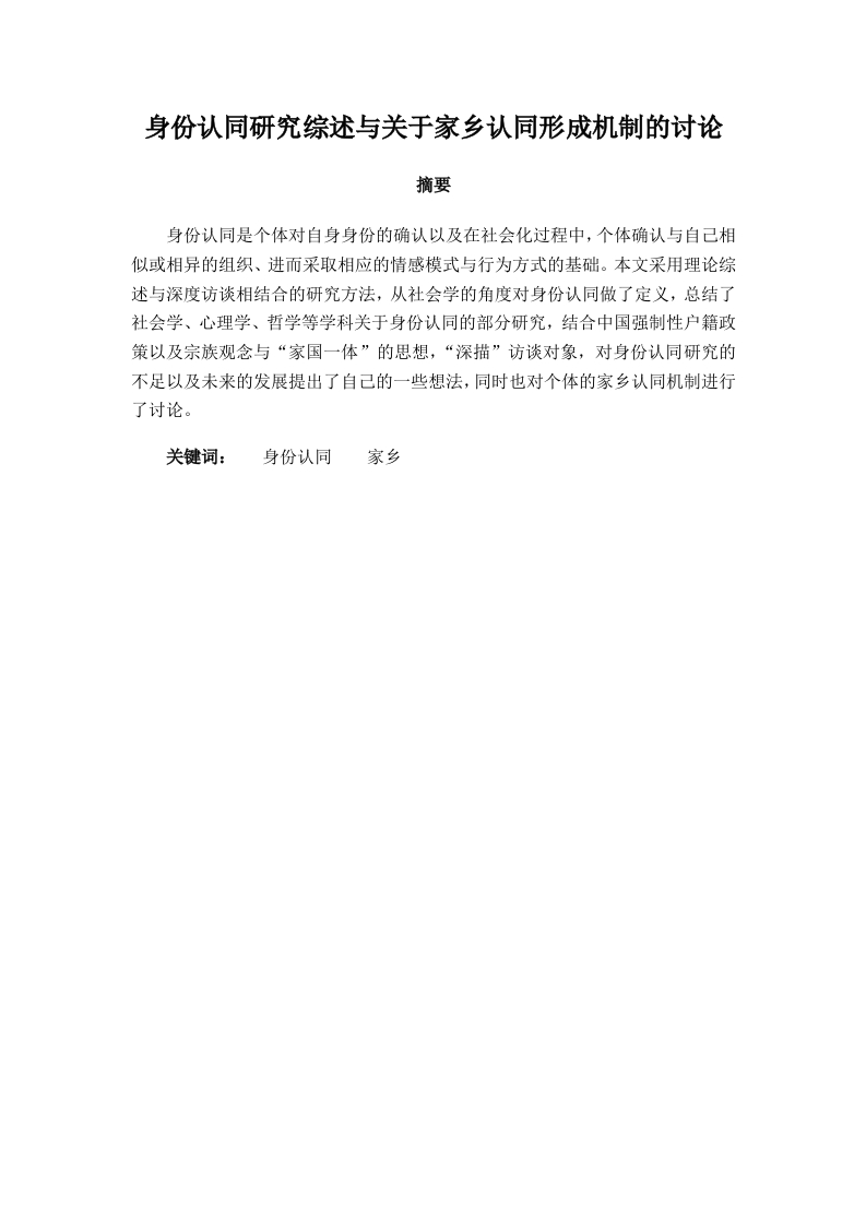 身份认同研究综述与关于家乡认同形成机制的讨论摘要身份认同是个体对自身身份的确认以及在社会化过程中,个体确认与自己相似或相异的组织、进而采取相应的情感模式与行为方式的基础。本文采用理论综述与深度访谈相结合的研究方法,从社会学的角度对身份认同做了定义,总结了社会学、心理学、哲学等学科关于身份认同的部分研究,结合中国强制性户籍政策以及宗族观念与“家国一体”的思想,“深描”访谈对象,对身份认同研究的不足以及未来的发展提出了自己的一些想法,同时也对个体的家乡认同机制进行关键词:身份认同家乡TitleAbstract目录1.研究主题与研究方法的选择11.1a研究方法11.1.1个案与访谈者的选择、确定11.3意义与成果22.身份认同的定义与相关概念…3,身份认同的研究起源与研究视角.34.身份认同的相关理论…4,1自我身份认同理论…4.1.1自我发展理论…4.1.2自我同-性理论.44.1.3米德符号互动论的自我观点54.2社会身份认同理论54.2.1社会认同理论54.2.2种族身份认同理论.55。中国背景下的身份认同..65.1户籍制度政策指令65,2宗族观念,"家国一体"的传统文化65.3近现代国民意识76.关于身份认同理论及其未来发展的讨论.87,以个人情感为核心、以"大家庭"为背景的家乡认同形成机制…87,1时间的积累与情感的沉淀.87.2经济、社会地位的认同感…127.3封闭化的"大家庭”…157.3.1户籍制度筑起的墙157.3.2权力结构织成的网…177.3,3地方语言画出的圈..188结论:综合的家乡认同形成机制19参考文献:20