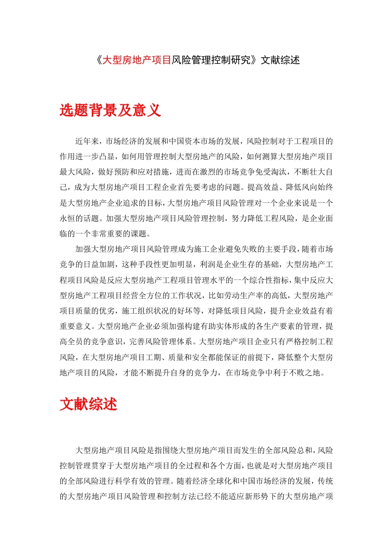 《大型房地产项目风险管理控制研究》文献综述选题背景及意义近年来,市场经济的发展和中国资本市场的发展,风险控制对于工程项目的作用进一步凸显,如何用管理控制大型房地产的风险,如何测算大型房地产项目最大风险,做好预防和应对措施,进而在激烈的市场竞争免受淘汰,不断壮大自己,成为大型房地产项目工程企业首先要考虑的问题。提高效益、降低风向始终是大型房地产企业追求的目标,大型房地产项目风险管理对一个企业来说是一个永恒的话题。加强大型房地产项目风险管理控制,努力降低工程风险,是企业面临的一个非常重要的课题。加强大型房地产项目风险管理成为施工企业避免失败的主要手段,随着市场竞争的日益加剧,这种手段性更加明显,利润是企业生存的基础,大型房地产工程项目风险是反应大型房地产工程项目管理水平的一个综合性指标,集中反应大型房地产工程项目经营全方位的工作状况,比如劳动生产率的高低,大型房地产项目质量的优劣,施工组织状况的好坏等,对降低项目风险,提升企业效益有着重要意义。大型房地产企业必须加强构建有助实体形成的各生产要素的管理,提高全员的竞争意识,完善风险管理体系。大型房地产项目企业只有严格控制工程风险,在大型房地产项目工期、质量和安全都能保证的前提下,降低整个大型房地产项目的风险,才能不断提升自身的竞争力,在市场竞争中利于不败之地。文献综述大型房地产项目风险是指围绕大型房地产项目而发生的全部风险总和,风险控制管理贯穿于大型房地产项目的全过程和各个方面,也就是对大型房地产项目的全部风险进行科学有效的管理。随着经济全球化和中国市场经济的发展,传统的大型房地产项目风险管理和控制方法已经不能适应新形势下的大型房地产项目风险管理控制的实践,大型房地产项目企业风险管理成为很多企业需要花大力气解决的问题,故而在上个世纪末期以来,各种现代项目风险管理的理论和方法不断被学术界重视和研究,形成了项目全过程风险管理、项目全生命周期风险管理和全面项目风险管理三种现代项目风险管理的方法和理论。国内外关于项目风险管理的研究很多,这些研究成为本文重要的文献和理论来源。国内研究方面路鹏飞(2011)对大型房地产项目风险管理的原则有着自己深入的研究,他认为大型房地产项目风险管理必须依据异地的原则,他通过对大型房地产企业在风险管理方面的实践做法进行总结,根据近年来的大型房地产工程的建设实践,并对国内外成功经验进行总结,认为大型房地产工程项目施工风险控制需要遵循两个基本原则,一是领导者推动原则,即企业的领导者必然是大型房地产工程项目风险管理的责任人,是企业风险控制的主要责任人,领导者应该创造制度条件和经济条件,让更多的员工充分参与项目风险管理,制定项目风险管理的目标和方针,组织建立项目风险管理体系,激发员工的积极性,增强员工风险控制的亲身体验,实现企业风险目标的内部环境:二是以人为本,全员参与的原则,即人的本质是思想和精神,管理的本质是人,管理的每一项工作,要抓住本质,全面提高人的积极性和创造性,具体到大型房地产项目风险管理而言,要让激发员工的积极性的一个最好的办法就是让尊重员工的价值,让员工参与到具体的管理过程中来,每一个内容都需要相应的人员来完善,不断提升大型房地产项目风险管理的内容。张利林(2011)也对大型房地产项目风险管理的原则研究较多,他认为大型房地产项目风险管理控制的基本原则也有两个,一是目标分解责任明确的原则,即大型房地产企业需要对项目风险进行了一次目标分解,以便确定风险降低指标和项目风险责任指标,根据岗位不同、管理内容不同,项目经理还进行二次目标分解,主要是对风险降低率目标和项目风险指标降低进行的,把总目标进行层层分解,确定每个岗位所承担的责任和风险控制目标,通过每个指标的完成来保证总目标的实现,责任落实到每一个人,项目风险控制才能达到较好的效果:二是管理内容与管理层次一致性原则,即为完成大型房地产项目风险管理目标,管理层次所对应的管理权力和管理内容必须相称,就必须建立一套相应的管理制度,否则就会发生责、权、利的不协调,授予管理层相应的权力,避免导致管理目标和管理结果的扭曲。刘慧霞(2009)对大型房地产项目风险的事前管理有着自己的研究,她认为大型房地产风险的事前管理指工程开工前,对影响工程风险的经济活动所进行分析,风险的事前管理大体包括:建立和健全计量手段和经济责任制、原始记录、风险预测、规定消耗定额、风险决策、制定风险管理计划,实行分级归口管理等内容。具体主要编制风险管理计划,包括技术保证措施计划、降低工程风险和管理费用等,对工程项目风险水平进行预测,采用正确的预算方法,确定风险发生范围,提出项目的风险管理的内容。大型房地产项目策划和风险预测是报标阶段的主要任务。施工企业组织有丰富经验的经济管理人员、合同管理人员和专业技术人员进行现场勘察,这主要是根据招标文件对工程概括的描述进行的,明确各层管理人员的相应管理责任,识别、评估项目可能出现的影响目标实现的风险因素,进行项目策划分析,在此基础上加以响应控制,以便减少项目实施过