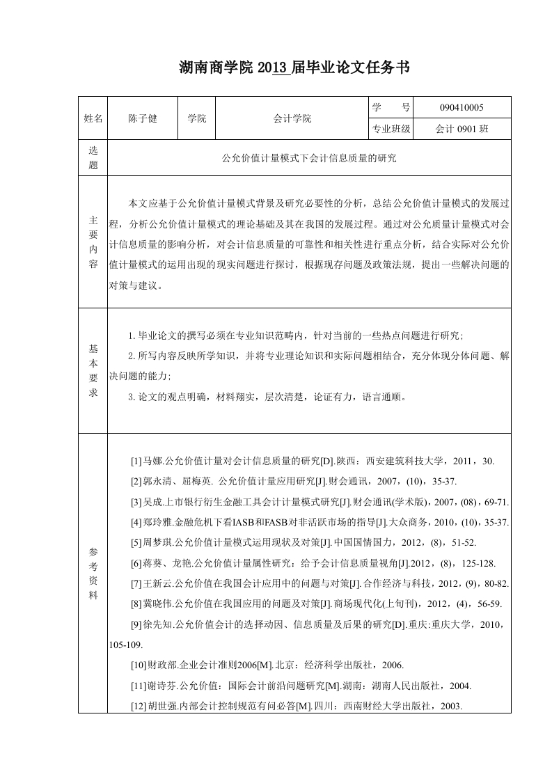湖南商学院2013届毕业论文任务书学号090410005姓名陈子健学院会计学院专业班级会计0901班选公允价值计量模式下会计信息质量的研究本文应基于公允价值计量模式背景及研究必要性的分析,总结公允价值计量模式的发展过主程,分析公允价值计量模式的理论基础及其在我国的发展过程。通过对公允质量计量模式对会要内计信息质量的影响分析,对会计信息质量的可靠性和相关性进行重点分析,结合实际对公允价容值计量模式的运用出现的现实问题进行探讨,根据现存问题及政策法规,提出一些解决问题的对策与建议。1.毕业论文的撰写必须在专业知识范畴内,针对当前的一些热点问题进行研究:基2.所写内容反映所学知识,并将专业理论知识和实际问题相结合,充分体现分体问题、解要决问题的能力:求3.论文的观点明确,材料翔实,层次清楚,论证有力,语言通顺。[1]马娜.公允价值计量对会计信息质量的研究D].陕西:西安建筑科技大学,2011,30[2]郭永清、屈梅英.公允价值计量应用研究).财会通讯,2007,(10),35-37.[3)吴成.上市银行衍生金融工具会计计量模式研究).财会通讯(学术版),2007,(08),6971.[4郑玲雅.金融危机下看ASB和FASB对非活跃市场的指导U.大众商务,2010,(10),35-37.[⑤]周梦琪.公允价值计量模式运用现状及对策).中国国情国力,2012,(⑧),51-52参考[6)]蒋葵、龙艳.公允价值计量属性研究:给予会计信息质量视角).2012,(8),125-128.资[7]王新云.公允价值在我国会计应用中的问题与对策合作经济与科技,2012,(9),80-82料[8]冀晓伟.公允价值在我国应用的问题及对策U.商场现代化(上旬刊),2012,(4),56-59.[9]徐先知.公允价值会计的选择动因、信息质量及后果的研究D]重庆:重庆大学,2010,105-109[10]财政部.企业会计准则2006①M).北京:经济科学出版社,2006.[11]谢诗芬.公允价值:国际会计前沿问题研究M刈.湖南:湖南人民出版社,2004[12]胡世强.内部会计控制规范有问必答M).四川:西南财经大学出版社,2003.[13]徐全华.试论会计稳健性与信息披露的相互影响).学术论坛,2010,(3),3943.[14李洪.公允价值计量与历史成本计量对会计核算的影响分析U.兰州商学院报,2012,(4),98-101.[15]葛家澍.关于在财务会计中采用公允价值的探讨U.会计研究,2007,(11)[16翁倩.公允价值能否提高会计信息质量一基于我国金融类上市公司数据的研究M中国会计学会高等工科院校分会第十八届学术年会(2011)论文集,2011.1-6.[1刀范云飞.会计准则趋同背景下公允价值计量准则的比较和评述一基于会计信息质量的视角).新会计,2012,(9),29-30、43、53.[18]张益民、薛卫孝、钱洪清.金融资产公允价值信息的价值相关性实证研究).现代商业,2008,(36),264.[19]余继高新会计准则公允价值应用中出现的问题与对策财经界,2010,(2),187.[20]Eccher,E.,Ramesh,K,and S.Thiagarajan,Fair Value Disclosures by Bank HoldingCompanies [J],Joumal of Accounting and Economics,1996,22,79-117.[21]Barth,M.,Fair Value Accounting:Evidence from Investment Securities and the MarketValuation of Banks [J],the Accounting Review,1994,69(1),1-25.[22]张倩.基于博弈论视角的公允价值评估问题分析D].湖北:武汉科技大学,2011,13-17、28.[23]阳捡江论公允价值及其变动对企业财务风险的影响一基于沪、深股市的经验证据D].重庆:重庆理工大学,2011,33-34[24师恩菊、张振芳.浅析公允价值计量对提高会计信息质量的影响).中国科技纵横,2012,(10),207.[25]刘蓉,财务会计的公允价值计量应用U.金融营销,2012,(8),83-84.[26)]张国康内部控制制度M上海:立信会计出版社,2003.[27刀罗士菊.公允价值在我国会计准则中的应用凹.知识经济,2012,(14),123-124.[28]郭昱、李亮基于估值角度的公允价值探讨).财会通讯(综合),2012,(⑧),6869[29]郝美丽基才决策有用观的公允价值计量应用与披露).中国乡镇企业会计,2012,(7),22-23[30]新企业会计准则重点难点解析编写组新企业会计准则重点难点解析.北京:企业管理出版社,2006,143.[31]朱晓霞.浅议公允价值计量及其对企业核算的影响).中国外资,2012,(14),72.[32]郭伟.公允价值计量在会计实务中的运用).财会通讯,2009,(34),86-87.[33]鹿晶.谈公允价值应用对企业经营成果的影响凹.群言堂,2012,(⑧),3840.[34]颜蕾.新企业会计准则吸引公允价值计量属性面临的问题及对策凹.现代会计,2012,(3),10-12.[35]Barth,M.E,clinch G.revalued Financial,Tangible and Intangible Assets:Associations withShare prices and Non-Market-Based Value Estimates [J].Journal of Accounting and Research,1998.[36]Danbolt Jo William Ree.Mark-To-Market Accounting and Valuation:Evidence from UKReal Estate and Investment Companies[R].Working Paper,University of Glasgow:Scotland,2007.[36]孙鬻.公允价值信息的价值相关性一基于我国新企业会计准则视角的研究D].辽宁,东北财经大学,2010,(11),22-30、89.[37刀周媛、吴瑕.公允价值和会计信息质量探讨与分析).现代商业,2009,(14),218.[38]花勇.公允价值与会计信息质量商业经济,2009,(09),28-30[39]刘英男,王维华.公允价值对财务报告信息质量相关性影响的实证分析凹.商业经济,2010,(01),37-39,116.[40]吴舒.公允价值审计对内部控制的需求分析).价值工程,2008,(02),156-159.[41]林琳.公允价值计量和披露审计准则几个重要问题的思考).审计月刊,2008,(01),12-14.[42]天相投资顾问有限公司.客观反映公允估值要求一有效保护投资者利益).中国证券报N,2008-9-16,(A07).进度2012年11月1日2012年11月15日2013年1月10日2013年5月12日安排-2012年11月15日-2013年1月10日2013年5月12日2013年5月16日应开题报告毕业论文初