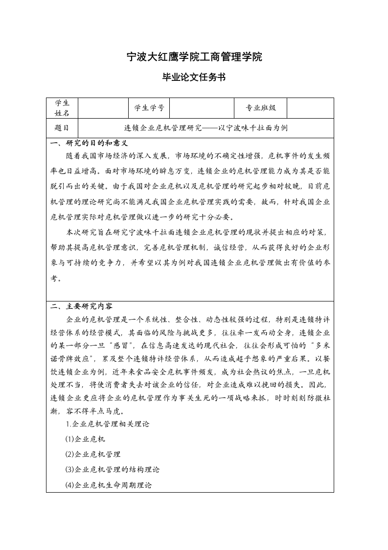 宁波大红鹰学院工商管理学院毕业论文任务书学生姓名学生学号专业班级题目连锁企业危机管理研究—以宁波味千拉面为例一、研究的目的和意义随着我国市场经济的深入发展,市场环境的不确定性增强,危机事件的发生频率也日益增高。面对市场环境的瞬息万变,连锁企业的危机管理能力成为其是否能脱引而出的关健。由于我国对企业危机以及危机管理的研究起步相对较晚,目前危机管理的理论研究尚不能满足我国企业危机管理实践的需要,故而,针对我国企业危机管理实际对危机管理做以进一步的研究十分必要。本次研究旨在研究宁波味千拉面连锁企业危机管理的现状并提出相应的对策,帮助其提高危机管理意识,完善危机管理机制,诚信经营,从而获得良好的企业形象与可持续的竞争力,并希望以其为例对我国连锁企业危机管理做出有价值的参考。二、主要研究内容企业的危机管理是一个系统性、整合性、动态性较强的过程,特别是连锁特许经营体系的经营模式,其面临的风险与挑战更多,往往牵一发而动全身,连锁企业的某一部分一旦“感冒”,在信息高速发达的现代社会,往往会形成可怕的“多米诺骨牌效应”,累及整个连锁特许经营体系,从而造成超乎想象的严重后果。以餐饮连锁企业为例,近年来食品安全危机事件频发,成为社会热议的焦点,一旦危机处理不当,将使消费者失去对该企业的信任,对企业造成难以挽回的损失。因此,连锁企业更应将企业的危机管理作为事关生死的一项战略来抓,时时刻刻防微杜渐,容不得半点马虎。1.企业危机管理相关理论(1)企业危机(2)企业危机管理(3)企业危机管理的结构理论(4)企业危机生命周期理论2.宁波味千拉面危机管理的现状(1)宁波味千拉面企业概述(2)企业近年典型危机事件(3)调查问卷设计(4)数据处理与分析3宁波味千拉面危机管理问题分析(1)企业职工危机意识薄弱(2)危机预警机制不完善(3)危机事件处理不及时(4)诚信危机处理有失4.加强连锁企业危机管理的对策(1)加强企业危机教育与培训(2)建立长效危机管理机制(3)加强危机沟通意识(4)诚信经营,合理营销三、实施方聚(调研、进度安排等)(一)调研方法1.文献研究法对大量相关国内外文献进行阅读、分类、理解与总结,了解危机管理的相关理论,为此次研究莫定理论基础,并且较为全面的掌握目前连锁企业危机管理的现状,并在此基础上借鉴诸多有效对策,结合宁波味千拉面连锁企业的危机管理实际,从而提出具有针对性的建议与对策。2.案例研究法本文采用了案例研究的方法,以宁波味千拉面连锁企业为例,分析了宁波味千拉面近年典型危机事件,如“骨汤门”事件、“被涨价”事件、员工离职事件等,并以宁波味千拉面作为研究对象,深入挖掘其我记管理目前存在的不足和问题,为本次研究提供了强有力的实证支持。3.问卷调查法本文通过问卷调查法,对宁波味千拉面企业职工,包括中高层管理者以及普通员工,进行了信息收集与问题反馈,深入了解了企业危机管理的重视程度、预警机制、危机事件处理时间与措施以及同行业企业绩效对比等,为本次研究提供了详实的数据基础。(二)进度安排:1.2015年9月中旬做好毕业论文学生选题。2.2015年10月底至11月上旬做好任务书正式下达、文献综述、外文文献译文、开题及开题答辩等工作。3.2015年12月中旬学生上交论文初稿。4.2016年4月10前,完成毕业论文的中期检查工作。5.2016年4月10日一2016年4月20日前,完成所有学生毕业论文的检测、指导教师评阅等工作。6.2016年4月20日一2016年5月15日,组织开展毕业论文答辩工作,评定论文成绩。7.2016年5月15日一2016年5月20日,论文成绩提交学院论文答辩委员会复议。8.2016年5月20日之前,毕业论文成绩录入系统。四、推荐阅读文献[1]金小芮.新媒体环境下企业危机公关的新思路[D].四川省社会科学院,2014.[2]朱晓婉.网络环境下乳制品企业危机管理模式研究[D].华中师范大学,2014.[3]王倩.企业危机公关策略研究[D].内蒙古大学,2014.[4]刘奕.“云”时代企业危机传播机理及管理研究[D].东华大学,2015.[5]陈华,刘荣.企业危机管理之路:如何将危机演变成商机[J门.管理现代,2013,04:22-25.[6]冯春海.企业与利益相关者的危机沟通策略研究[D].中国传媒大学,2016[7]王蕾,邢慧斌,王玉成.国外企业危机管理研究评述[J].云南财经大学学报(社会科学版),2011,06:49-53.