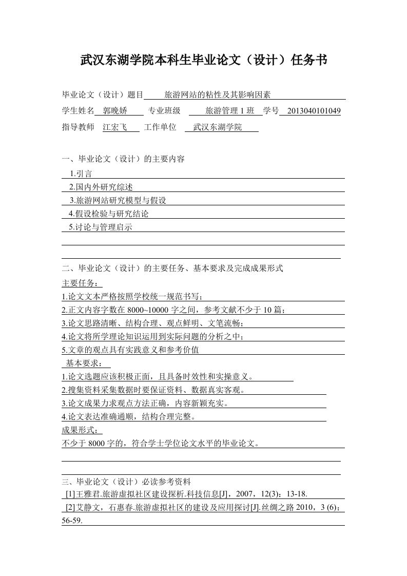 武汉东湖学院本科生毕业论文(设计)任务书毕业论文(设计)题目旅游网站的粘性及其影响因素学生姓名郭晚娇专业班级旅游管理1班学号2013040101049指导教师江宏飞工作单位武汉东湖学院一、毕业论文(设计)的主要内容1.引言2.国内外研究综述3旅游网站研究模型与假设4.假设检验与研究结论5.讨论与管理启示二、毕业论文(设计)的主要任务、基本要求及完成成果形式主要任务:1.论文文本严格按照学校统一规范书写:2.正文内容字数在800010000字之间,参考文献不少于10篇:3.论文思路清晰、结构合理、观点鲜明、文笔流畅:4论文将所学理论知识运用到实际问题的分析之中:5,文章的观点具有实践意义和参考价值基本要求:1.论文选题应该积极正面,且具备时效性和实操意义。2.搜集资料采集数据时要保证资料、数据真实客观。3.论文成果力求观点方法正确,内容新颖充实。4.论文表达准确通顺,结构合理完整。成果形式:不少于8000字的,符合学士学位论文水平的毕业论文。三、毕业论文(设计)必读参考资料[1]王雅君.旅游虚拟社区建设探析.科技信息,2007,12(3):13-18[2]艾静文,石惠春旅游虚拟社区的建设及应用探讨[J.丝绸之路2010,3(6):56-59[3]苗学玲.旅游网络论坛的学术界定、发展现状与影响U.旅游论坛,2009,2(2):16-17.「4]郑雪莉.虚拟社区国外研究综述[U.图书馆学研究,2012,12(3):22-25[5]郑红燕.社交网站持续使用的实证研究U.信息系统学报,2011,12(3):23-33[6]余晓娟.旅游者网络社区的功能和市场意义研究.旅游学刊,2007(6):80-85.[]苗学玲.自驾车旅游研究的新视角:旅游网络论坛的主帖分类研究).商业研究,2006,(11):7-15[8]戴斌.基于网络的旅游行为与旅游行为的网络化U.旅游学刊,2007(4):5-6.[9]保继刚,苗学玲.旅游虚拟社区/结伴旅行之质性研究旅游学刊,2007(8):48-54[10]郭俊俊.旅游虚拟社区成员行为对旅游决策的影响研究)杭州:浙江大学旅游管理系,2008:16-17指导教师签名:教研室主任签名:院长签名(章):年月日