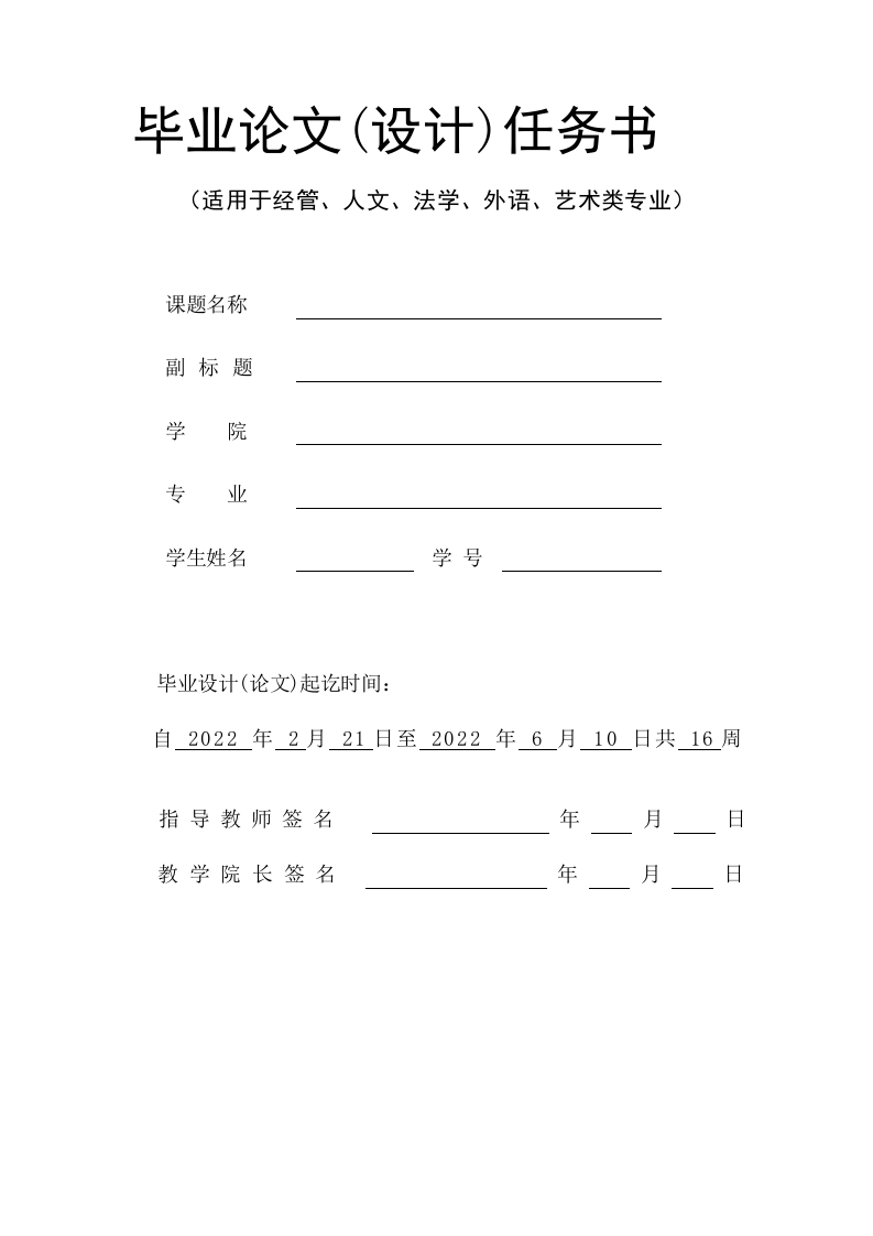 毕业论文(设计)任务书(适用于经管、人文、法学、外语、艺术类专业)课题名称副标题学院专业学生姓名学号毕业设计(论文)起讫时间:自2022年2月21日至2022年6月10日共16周指导教师签名年日教学院长签名年月日一、毕业论文(设计)的要求二、毕业论文(设计)的工作内容三、毕业论文(设计)进度安排序号论文(设计)各阶段名称时间安排(教学周)同组学生姓名:四、应收集的资料及主要参考文献