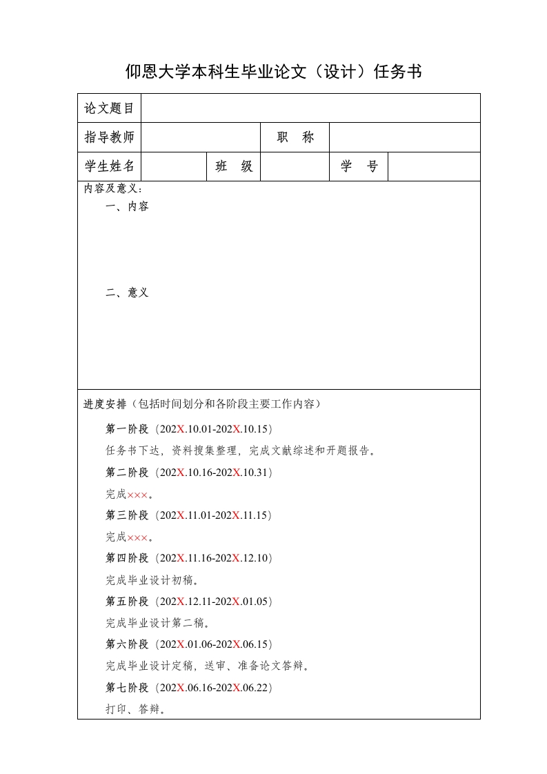仰恩大学本科生毕业论文(设计)任务书论文题目指导教师职称学生姓名班级学号内容及意义:一、内容二、意义进度安排(包括时间划分和各阶段主要工作内容)第-阶段(202X.10.01-202X10.15)任务书下达,资料搜集整理,完成文献综述和开题报告。第二阶段(202X.10.16-202X.10.31)第三阶段(202X.11.01-202X.11.15)第四阶段(202X.11.16-202X.12.10)完成毕业设计初稿。第五阶段(202X.12.11-202X.01.05)完成毕业设计第二稿。第六阶段(202X.01.06-202X.06.15)完成毕业设计定稿,送审、准备论文答辩。第七阶段(202X.06.16-202X.06.22)打印、答辩。参考资料及文献:[[4[6[10]系审核意见:达到本科生毕业设计的要求,请按此任务书开展毕业设计活动。院(系)领导签名:202x年10月10日备注:本任务书由指导教师填写相关栏目,经系审核同意后执行。