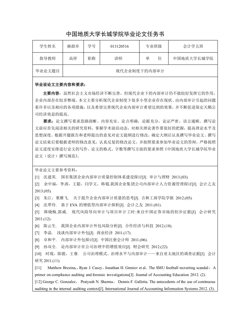 中国地质大学长城学院毕业论文任务书学生姓名赫甜亦学号013120516专业班级会计学五班指导教师高祥职称讲师单位中国地质大学长城学院毕业论文题目现代企业制度下的内部审计毕业设论文主要内容和要求:主要内容:虽然社会主义市场经济不断完善,但现代企业下的内部审计仍不能较好发挥它的作用,企业内部存在较多弊端。本文主要分析现代企业制度下很多小型企业存在现状、由内部审计引起的问题着许多以及相应的各项措施,以及希望完善现代企业内部审计希望达到的效果,并不断促进保定天鹅公司经济效益的提高。要求:论文撰写要求思路清晰、内容充实、论点明确,论据充分,论证严密,语言通顺。撰写论文前应首先阅读相关的研究资料,掌握学术前沿动态,对相关理论著作要很好的把握,提高理论水平及思想深度。根据开题报告和老师提出的意见对论文提纲进行修改,确定大纲后认真撰写毕业论文。撰写论文结束后要根据老师的修改意见,认真反复的修改论文,并按照要求参加毕业论文的答辩,严格按照论文进度安排进行论文的写作。论文的格式、字数等撰写方面的要求参照《中国地质大学长城学院毕业论文(设计)撰写规范》。毕业论文主要参考资料:[1]沈建英.国有集团企业内部审计质量控制体系建设探讨).审计与理财2013.(03).[2]余中福,李涛,王聪,闫学文,韩锟我国企业集团公司内部审计人力资源管理探讨凹会计之友2013.(05).[3)]朱江,粟雁飞.关于提升企业内部审计质量的思考).吉林工商学院学报2012.(05)[4)沈翠玲.基于EVA的增值型内部审计探析U.会计之友2011.(01).[)韩晓梅,郭威。现代风险导向审计与项目审计工时:来自中国证券市场的初步证据凹.会计研究2011.(12).[6]陈云生.我国企业内部审计外包风险分析).合作经济与科技2012.(18)[7)李晶.浅谈内部审计外包).商业经济2011.(17).[8)卓和平.内部审计外包探讨).中国注册会计师2011.(06.[9]孙双全.论内部审计在公司治理中的增值效应).财会研究2012.(22).[10]时现,陈骏,王睿.公司治理模式、治理水平与内部审计一一来自亚太地区的调查证据).会计研究2011.(11)[11]Matthew Brezina,,Ryan J.Casey,Jonathan H.Grenier et al..The SMU football recruiting scandal:Aprimer on compliance auditing and forensic investigations[J.Joumal of Accounting Education 2012.(2).[12]George C.Gonzalez,Pratyush N.Sharma,Dennis F.Galletta.The antecedents of the use of continuousauditing in the internal auditing context[J].International Journal of Accounting Information Systems 2012.(3).毕业设论文应完成的主要工作:1.利用中国知网、维普、万方等数据库完成与毕业论文相关内容的论文的检索:利用图书馆的图书资源查阅相关的理论内容:充分的利用互联网进行资料的检索收集。2.与实习相关的选题要注意在实习过程中观察收集相关的数据:要做实证方面的论文要多方面搜集相关的地区及国家发布的统计数据。3.认真撰写开题报告,并对开题报告中指导教师所提出的意见进行修改。4.认真撰写论文,并根据指导教师的意见进行修改。5.论文定稿之后,按照要求进行毕业论文的答辩。毕业论文进度安排:序号毕业论文各阶段内容时间安排备注确定毕业论文的选题,收集资料,整理资料,完成论文的任务书2015-10-15至2015-10-31编写论文提纲,撰写开题报告,进2行开题。2015-11-1至2015-11-20实习期间进行一步查找资料,作社3会调查。2015-11-21至2015-11-30撰写论文,完成第一稿,并交指导4教师2015-12-1至2016-1-155指导教师阅改论文。2016-1-16至2016-1-31修改论文,完成第2稿,并交指导6教师。2016-2-1至2016-2-29指导教师阅改论文,完成中期检查表。2016-3-1至2016-3-15修改论文,完成第3稿,并交指导教师。2016-3-16至20164-10指导教师阅改论文,并返还学生,修改后立即交指导教师。20164-11至20164-3010专家评阅。2016-5-1至2016-5-1011毕业论文答辩。2016-5-11至2016-5-24评定学生最终论文成绩,评出院内12优秀论文。2016-5-25至2016-5-31课题信息:课题性质:设计口论文√课题来源:教学√科研口生产口其它口发出任务书日期:指导教师签名:年月日教研室意见:教研室主任签名:年月日学生签名:
