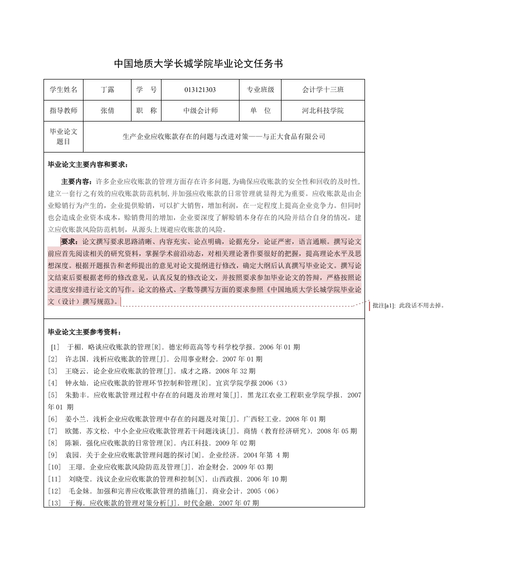 中国地质大学长城学院毕业论文任务书学生姓名丁露学号013121303专业班级会计学十三班指导教师张倩职称中级会计师单位河北科技学院毕业论文题目生产企业应收账款存在的问题与改进对策一一与正大食品有限公司毕业论文主要内容和要求:主要内容:许多企业应收账款的管理方面存在许多问题,为确保应收账款的安全性和回收的及时性,建立一套行之有效的应收账款防范机制,并加强应收账款的日常管理就显得尤为重要。应收账款是由企业赊销行为产生的,企业提供赊销,可以扩大销售,增加利润,在一定程度上提高企业竞争力。但同时也会造成企业资本成本,赊销费用的增加,企业要深度了解赊销本身存在的风险并结合自身的情况,建立应收账款风险防范机制,从源头上规避应收账款的风险。要求:论文撰写要求思路清晰、内容充实、论点明确,论据充分,论证严密,语言通顺。撰写论文前应首先阅读相关的研究资料,掌握学术前沿动态,对相关理论著作要很好的把握,提高理论水平及思想深度。根据开题报告和老师提出的意见对论文提纲进行修改,确定大纲后认真撰写毕业论文。撰写论文结束后要根据老师的修改意见,认真反复的修改论文,并按照要求参加毕业论文的答辩,严格按照论文进度安排进行论文的写作。论文的格式、字数等撰写方面的要求参照《中国地质大学长城学院毕业论文(设计)撰写规范》。批注a小:此段话不用去掉。毕业论文主要参考资料:[1]于楣.略谈应收账款的管理[R].德宏师范高等专科学校学报.2006年01期[2]许志国.浅析应收账款的管理[J刀.公用事业财会.2007年01期王晓云.论企业应收账款的管理[J刀.成才之路.2008年32期[4]钟永灿.论应收账款的管理环节控制和管理[].宜宾学院学报2006(3)[5]朱勤丰,应收账款管理过程中存在的问题及治理对策[J刀.黑龙江农业工程职业学院学报.2007年01期[6]姜小兰.浅析企业应收账款管理中存在的问题及对策[J刀.广西轻工业.2008年01期[7]欧懿.苏文松.中小企业应收账款管理若干问题浅谈[J刀.商情(教育经济研究).2008年05期[8]陈颗.强化应收账款的日常管理[R].内江科技.2009年02期[9]袁园.关于企业应收账款管理问题的探讨[.企业经济.2004年第4期[10]王璟.企业应收账款风险防范及管理[J刀.治金财会,2009年03期[11]刘晓莹.浅议企业应收账款的管理和控制[N].山西政报.2006年10期[12]毛金妹.加强和完善应收账款管理的措施[刀.商业会计.2005(06)[13]于梅.应收账款的管理对策分析[J].时代金融.2007年07期[14]Robert Cole.Lon Mahler.Consumer and Business Credit Management.IrwinMcGraw-Hillcompanies.1998 [15]Michael Dennis.Credit and Collection Handbook.Prentice Hall.1999毕业论文应完成的主要工作:1.利用中国知网、维普、万方等数据库完成与毕业论文相关内容的论文的检索:利用图书馆的图书资源查阅相关的理论内容:充分的利用互联网进行资料的检索收集。2.与实习相关的选题要注意在实习过程中观察收集相关的数据:要做实证方面的论文要多方面搜集相关的地区及国家发布的统计数据。3.认真撰写开题报告,并对开题报告中指导教师所提出的意见进行修改。4.认真撰写论文,并根据指导教师的意见进行修改。5.论文定稿之后,按照要求进行毕业论文的答辩。毕业论文进度安排:序号毕业论文各阶段内容时间安排备注确定毕业论文的选题,收集资料,整理资料,12015-10-15至2015-10-31完成论文的任务书编写论文提纲,撰写开题报告,进行开题。2015-11-1至2015-11-203实习期间进行一步查找资料,作社会调查。2015-11-21至2015-11-304撰写论文,完成第一稿,并交指导教师2015-12-1至2016-1-155指导教师阅改论文。2016-1-16至2016-1-316修改论文,完成第2稿,并交指导教师。2016-2-1至2016-2-297指导教师阅改论文,完成中期检查表。2016-3-1至2016-3-15修改论文,完成第3稿,并交指导教师。2016-3-16至20164-10指导教师阅改论文,并返还学生,修改后立即交指导教师。20164-11至20164-3010专家评阅。2016-5-1至2016-5-1011毕业论文答辩。2016-5-11至2016-5-2412评定学生最终论文成绩,评出院内优秀论文。2016-5-25至2016-5-31课题信息:课题性质:设计口论文√课题来源:教学√科研口生产口其它口发出任务书日期:指导教师签名:年月日教研室意见:教研室主任签名:年月日学生签名: