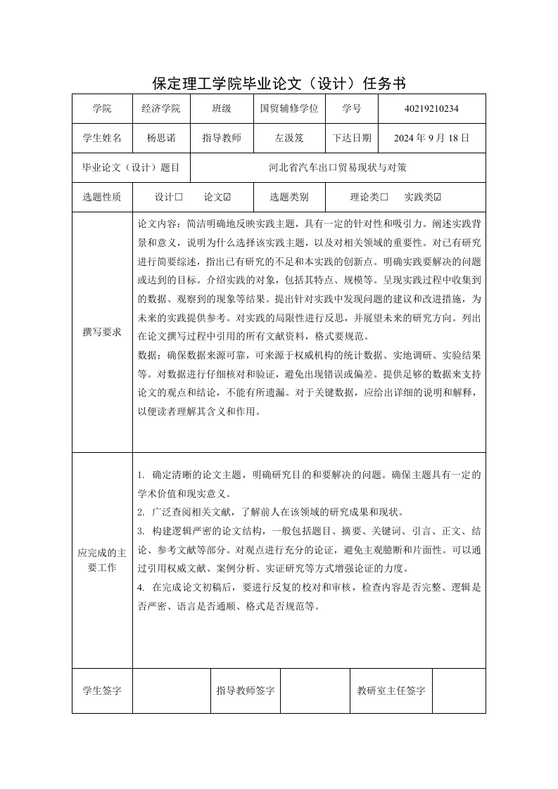 保定理工学院毕业论文(设计)任务书学院经济学院班级国贸辅修学位学号40219210234学生姓名杨思诺指导教师左汲笈下达日期2024年9月18日毕业论文(设计)题目河北省汽车出口贸易现状与对策选题性质设计口论文☑选题类别理论类口实践类☑论文内容:简洁明确地反映实践主题,具有一定的针对性和吸引力。阐述实践背景和意义,说明为什么选择该实践主题,以及对相关领域的重要性。对已有研究进行简要综述,指出己有研究的不足和本实践的创新点。明确实践要解决的问题或达到的目标。介绍实践的对象,包括其特点、规模等。呈现实践过程中收集到的数据、观察到的现象等结果。提出针对实践中发现问题的建议和改进措施,为未来的实践提供参考。对实践的局限性进行反思,并展望未来的研究方向。列出撰写要求在论文撰写过程中引用的所有文献资料,格式要规范。数据:确保数据来源可靠,可来源于权威机构的统计数据、实地调研、实验结果等。对数据进行仔细核对和验证,避免出现错误或偏差。提供足够的数据来支持论文的观点和结论,不能有所遗漏。对于关键数据,应给出详细的说明和解释,以便读者理解其含义和作用。1.确定清晰的论文主题,明确研究目的和要解决的问题。确保主题具有一定的学术价值和现实意义。2.广泛查阅相关文献,了解前人在该领域的研究成果和现状。3.构建逻辑严密的论文结构,一般包括题目、摘要、关键词、引言、正文、结应完成的主论、参考文献等部分。对观点进行充分的论证,避免主观臆断和片面性。可以通要工作过引用权威文献、案例分析、实证研究等方式增强论证的力度。4.在完成论文初稿后,要进行反复的校对和审核,检查内容是否完整、逻辑是否严密、语言是否通顺、格式是否规范等。学生签字指导教师签字教研室主任签字