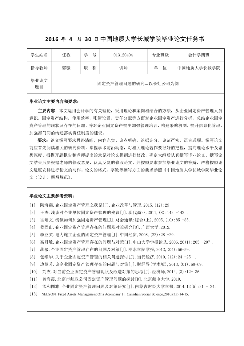 2016年4月30日中国地质大学长城学院毕业论文任务书学生姓名任敏学号013120404专业班级会计学四班指导教师郭薇职称讲师单位中国地质大学长城学院毕业论文固定资产管理问题的研究一以长虹公司为例题目毕业论文主要内容和要求:主要内容:本文运用会计学的有关理论,采用理论和案例相结合的方法,从企业固定资产管理人员意识,固定资产结构,使用效率,账簿设置,责任分配等方面对企业固定资产进行分析,总结企业固定资产管理的现状及存在的问题,并对企业固定资产提出加强管理培训,构建采购机制,提升信息化管理,加强部门间的沟通落实责任制度的建议。要求:论文撰写要求思路清晰、内容充实、论点明确,论据充分,论证严密,语言通顺。撰写论文前应首先阅读相关的研究资料,掌握学术前沿动态,对相关理论著作要很好的把握,提高理论水平及思想深度。根据开题报告和老师提出的意见对论文提纲进行修改,确定大纲后认真撰写毕业论文。撰写论文结束后要根据老师的修改意见,认真反复的修改论文,并按照要求参加毕业论文的答辩,严格按照论文进度安排进行论文的写作。论文的格式、字数等撰写方面的要求参照《中国地质大学长城学院毕业论文(设计)撰写规范》。毕业论文主要参考资料:[1]陶海燕.企业固定资产管理之我见[J刀.企业改革与管理,2015,(12):29[2]王杰.浅谈对企业单位固定资产管理的建议[J].现代商业,2011,(8):142-142.[3]雷培文.浅谈如何加强固定资产管理[J刀.财会通讯:综合(上),2005,(10):85-85.[4]蓝固山.企业固定资产管理存在的问题及对策研究[D】.广西大学,2012.[5]李亚芙.电力施工企业的固定资产管理[J刀.中国经贸,2008,(22):28-29.高月敏.企业固定资产管理存在的问题与对策[J刀.中山大学学报论丛,2006,26(1):205-207.[7]蒋薇.企业固定资产管理存在的问题及对策[J].丽水学院学报,2012,(04):56-59.包维华.关于企业固定资产管理的相关问题探讨[J刀.当代经济,2010,(12):24-25[9]边慧芳.论企业固定资产管理存在的问题与对策[J刀.财经界(学术版),2013,(01):6869.[10]刘杰.对当前企业固定资产管理现状及改进对策的思考[J刀.经济师,2014,(3):1236.[11]曾海霞.北京市邮政公司固定资产管理问题的探讨[D].北京邮电大学,2010.[12]孟和图雅.企业固定资产管理问题及对策研究[J刀.内蒙古财经大学学报,2014.12(⑤):21-24.NELSON.Fixed Assets Management Of a Acompany[J].Canadian Social Science,2010,(35):14-15.毕业论文应完成的主要工作:1.利用中国知网、维普、万方等数据库完成与毕业论文相关内容的论文的检索:利用图书馆的图书资源查阅相关的理论内容:充分的利用互联网进行资料的检索收集。2.与实习相关的选题要注意在实习过程中观察收集相关的数据:要做实证方面的论文要多方面搜集相关的地区及国家发布的统计数据。3.认真撰写开题报告,并对开题报告中指导教师所提出的意见进行修改。4.认真撰写论文,并根据指导教师的意见进行修改。5.论文定稿之后,按照要求进行毕业论文的答辩。毕业论文进度安排:序号毕业论文各阶段内容时间安排备注确定毕业论文的选题,收集资料,整理资料,2015-10-15至2015-10-31完成论文的任务书编写论文提纲,撰写开题报告,进行开题。2015-11-1至2015-11-20实习期间进行一步查找资料,作社会调查。2015-11-21至2015-11-304撰写论文,完成第一稿,并交指导教师2015-12-1至2016-1-155指导教师阅改论文。2016-1-16至2016-1-31修改论文,完成第2稿,并交指导教师。2016-2-1至2016-2-297指导教师阅改论文,完成中期检查表。2016-3-1至2016-3-15修改论文,完成第3稿,并交指导教师。2016-3-16至2016-4-10指导教师阅改论文,并返还学生,修改后立即92016-4-11至2016-4-30交指导教师。10专家评阅。2016-5-1至2016-5-1011毕业论文答辩。2016-5-11至2016-5-24评定学生最终论文成绩,评出院内优秀论文。2016-5-25至2016-5-31课题信息:课题性质:设计口论文√课题来源:教学√科研口生产口其它口发出任务书日期:指导教师签名:年月日教研室意见:教研室主任签名:年月学生签名: