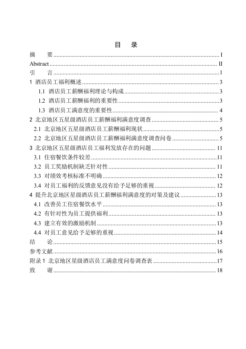 目录摘要..Abstract.…引言1酒店员工福利概述…1.1酒店员工薪酬福利理论与构成31.2酒店员工薪酬福利的重要性13酒店员工满意度的重要性..42北京地区五星级酒店员工薪酬福利满意度调查...…52.1北京地区五星级酒店员工薪酬福利现状52.2北京地区五星级酒店员工薪酬福利满意度调查问卷3北京地区五星级酒店员工福利发放存在的问题113.1住宿餐饮条件较差.3.2员工奖励机制缺乏针对性113.3对绩效考核标准不明确..123.4对员工福利的反馈意见没有给予足够的重视124提升北京地区星级酒店员工薪酬福利满意度的对策及建议.134.1改善员工住宿餐饮水平134.2有针对性为员工提供福利…134.3建立有效的激励机制4.4对员工意见给予足够的重视..14结论附录1北京地区星级酒店员工满意度问卷调查表.…17致谢沈阳城市学院毕业设计(论文)摘要酒店业要想得到长久的发展,就要抓住员工培训和发展的问题,酒店发展的前提是员工与酒店的共同成长。员工是一个酒店的基础,酒店依靠员工的服务获得利润。对于酒店的任意部门来讲,一旦发生核心员工离职的现象,那么整个团队都会发生天翻地覆的变化,酒店的经营状态必然会受到影响。本文基于对北京地区五星级酒店员工的薪酬福利待遇满意度情况的调查,以调查报告的形式,通过分析北京地区五星级酒店的员工薪酬福利制度存在的问题了解员工满意的程度研究并分析影响员工对酒店满意度的因素,并对结果进行剖析,总结出北京地区五星级酒店员工薪酬福利方面存在的问题,并相应提出改善员工薪酬福利机制的对策,重视员工的意见,从而提高员工的满意度,使员工可以更好的完成酒店工作为酒店创造更大的利益。关键词:薪酬福利待遇;薪酬管理;员工满意度沈阳城市学院毕业设计(论文)AbstractWith the development of economy,market competition is becomingincreasingly.To solve the problem of staff training and development is one ofthe most important part during the construction of the hotel,and the growth ofstaff and hotel is also the premise of hotel development.The value of the hotelstaffs is not only their own ability and quality but also their contribution to thehotel.Employees are the foundation of a hotels,and hotels rely on the servicesof employees to earn profits.Moreover,in the talent market,high-qualityemployees are what every hotel wants to recruit,so job-hopping often happensto high-quality employees.No matter which department of the hotel,once thecore staff quits,the whole team will be completely changed,and the operationstate of the hotel will be affected in some extent.This article is based on theinvestigation of employee satisfaction of Beijng,to understand the satisfactionand dissatisfaction of employees,and to improve their job satisfaction throughimprovement,so as to create greater benefits for the hotel.By investigating theemployee welfare satisfaction survey of Beijing,and analyzing the results,thisartcle summarizes the existing problems,and puts forward the problems whichshould be paid attention to in the process of hotel development.Keywords:welfare mechanism;salary management;employee satisfaction