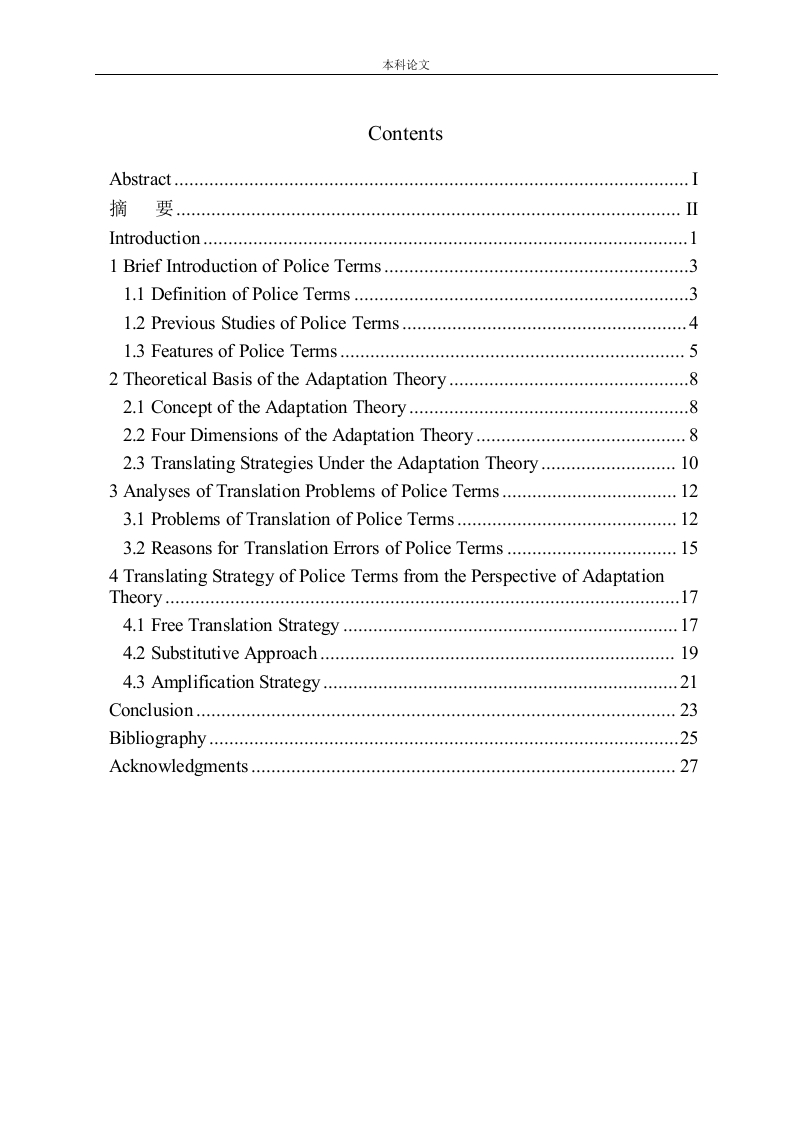 本科论文ContentsAbstract............摘要.…Introduction.…I Brief Introduction of Police Terms.31.I Definition of Police Terms..31.2 Previous Studies of Police Terms..41.3 Features of police Terms.52 Theoretical Basis of the Adaptation Theory2.1 Concept of the Adaptation Theory.82.2 Four Dimensions of the Adaptation Theory...2.3 Translating Strategies Under the Adaptation Theory........................103 Analyses of Translation Problems of Police Terms..........123.1 Problems of Translation of Police Terms..123.2 Reasons for Translation Errors of Police Terms .................154 Translating Strategy of Police Terms from the Perspective of AdaptationTheory.…174.1 Free Translation Strategy.....174.2 Substitutive Approach....194.3 Amplification Strategy....21Conclusion.…23Bibliography…25Acknowledgments444444444444444444427本科论文AbstractWith the development of economic globalization,the number ofinternational crime is increasing in recent years.Therefore,international policecommunication and cooperation have become more essential than before.Thissets higher demands for the English level of Chinese police.There are two mainaspects in the study of domestic police English translation:public signs andpolice terms.Police terms are designed to meet the needs of the police.At lexical,syntactic,textual and other levels,police terms are closely related to the use oflanguage in specific activities such as public security administration,criminalinvestigation,exit and entry administration and so on,which are covered byforeign-related police work.Under the guidance of adaptation theory,this thesis will focus on someproblems in the translation of policing terms.Term translation as a majordifficulty in English translation,the translator will make mistakes in thetranslation of terms due to his carelessness.Some translation strategies based onadaptation theory are summarized through the study of these problems.Keywords:translation of police terms;adaptation theory;translation strategies本科论文摘要最近几年,随着经济全球化的不断发展,国际犯罪事件也逐渐增多,因此国际间的警务交流与合作是必不可少的,警务英语也已经成为了专门用途英语中不可或缺的组成部分。目前国内的警务英语翻译研究主要存在于两大方面:警务公示语和警务术语。在需求方面,警务术语是为满足警察这一特定职业的工作需求而设计的。在内容上,警务术语与警察这一具体使用职业有关。在词汇、句法、语篇等层面上,警务术语与公安管理、刑事侦查、出入境管理等具体活动中的语言使用密切相关,是公安涉外工作中所使用的重要语言工具。本文将在顺应论的指导下,结合警务术语的定义和特点,重点研究目前其翻译过程中存在的一些问题。术语翻译作为英语翻译中的一大难点,翻译者会因为疏忽大意选词不当,导致术语严重背离原意的翻译失误,通过研究这些问题总结出以顺应论为基础的一些翻译方法。关键词:警务术语翻译:顺应论:翻译方法