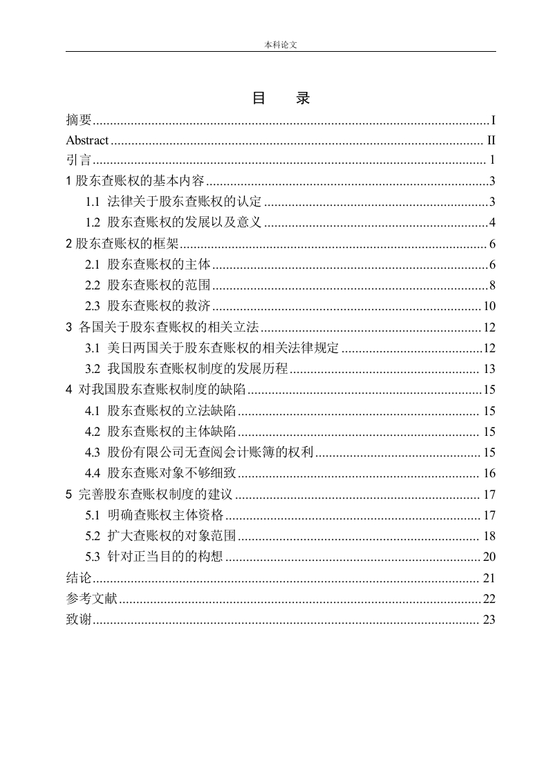 本科论文目录....................Abstract.…引言1股东查账权的基本内容31.1法律关于股东查账权的认定1.2股东查账权的发展以及意义2股东查账权的框架2.1股东查账权的主体…2.2股东查账权的范围…82.3股东查账权的救济….103各国关于股东查账权的相关立法…3.1美日两国关于股东查账权的相关法律规定123.2我国股东查账权制度的发展历程134对我国股东查账权制度的缺陷154.1股东查账权的立法缺陷…154.2股东查账权的主体缺陷154.3股份有限公司无查阅会计账簿的权利154.4股东查账对象不够细致165完善股东查账权制度的建议…175.1明确查账权主体资格175.2扩大查账权的对象范围185.3针对正当目的的构想20结论…21参考文献22致谢…23本科论文摘要由于商品经济的高速发展,市场规模的逐渐扩大,公司的发展规模摆脱了个人经营模式,以集资合伙方式的新型公司诞生。一种以股东出资与所有权外置的股份有限公司走进人类生活。这种较高的集资能力以及相对应的分散投资者投资风险的特点让企业不再限于个人的投资水平,也使得公司日益发展壮大。在这种模式下的公司产生了所有权与经营者不一致的委托代理模式。在该模式下公司的管理者获得了对公司的排他性管理权利,但是作为出资的股东却不能享有对公司的管理权,所以在权利外置的情况下必然要求保护股东的权利。因此为了解决这一问。股东对公司拥有着监督权,但是要想监督权的有效实施,股东必须还要对该公司拥有知情权,作为需要对公司拥有知情情况,又将矛头指向了公司的账务账簿,因此作为股东对公司知情权的一项重要内容,股东的查账权便显得格外重要。但是我国的公司法关还是处于待完善阶段。随着公司的日益发展,现有的公司法规定的查账权,无疑将是制约公司发展的重要阻碍,将大大不利于公司的发展和司法实践的运用。在此,本文将结合社会司法实践以及理论研究,重点剖析股东查账权存在的弊端以及本人自认为较为有效的改进建议。主要针对股东查账权的概念、性质、历史发展以及社会实践的运用并结合现实案例以及对国内外进行比较的方法总结现有公司法关于查账权的不足之处和对完善查账权制度的建议。关键词:股东查账权:主体资格:正当目的:查阅权本科论文AbstractDue to the rapid development of the commodity economy and the gradualexpansion of the market scale,the development scale of the company got rid ofthe individual business model and a new type of company was born in the formof fund-raising and partnership.A kind of stock limited company withshareholder's contribution and ownership outside enters the human life.Thishigher ability to raise capital and the corresponding diversification of investors'investment risk make the enterprise not only limited to the individual investmentlevel,but also make the company grow stronger and stronger.but theshareholders as capital contribution cannot enjoy the right to manage thecompany.Therefore,the rights of shareholders must be protected when therights are outside the company.So to solve this problem.Shareholders of thecompany has the supervision,but to the effective implementation of thesupervision,shareholders must have the company has the right to know,as aneed for the company has close to the situation,However,the provisions of thecompany law of China on the audit rights of shareholders are vague and rough,not detailed enough,too simple,or in the stage of improvement.With theincreasing development of the company,the audit right of the existing companylaw will undoubtedly be an important obstacle to the development of thecompany,which will be greatly detrimental to the development of the companyand the application of judicial practice.Here,this paper will combine the socialjudicial practice and theoretical research,focusing on the analysis of theshareholders'audit rights of the existing shortcomings and I think more effectiveimprovement Suggestions.Based on the concept,nature,historical developmentand social practice of the audit right of shareholders,this paper summarizes thedeficiencies of the audit right of the existing company law and the Suggestionsfor improving the audit right system by combining with the practical cases andcomparing the domestic and foreign methods.Key words:shareholder audit rights;subject qualification;just purpose;improve your suggestions