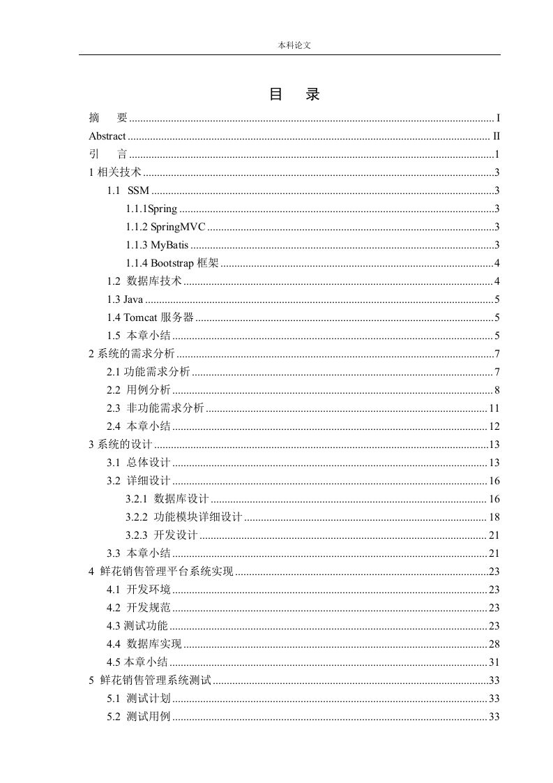 本科论文目录摘要Abstract引言1相关技术31.1.1Spring........1.1.2 SpringMVC31.1.3 MyBatis...........31.1.4 Bootstrap框架1.2数据库技术…1.3 Java......1.4 Tomcat服务器51.5本章小结.52系统的需求分析.2.1功能需求分析72.2用例分析…82.3非功能需求分析112.4本章小结123系统的设计…3.1总体设计…3.2详细设计….163.2.1数据库设计163.2.2功能模块详细设计183.2.3开发设计…213.3本章小结…214鲜花销售管理平台系统实现.234.1开发环境234.2开发规范…234.3测试功能234.4数据库实现284.5本章小结…315鲜花销售管理系统测试335.1测试计划5.2测试用例本科论文5.2.1用户建立订单.345.2.2用户取消订单345.2.3管理员处理订单345.2.4管理员取消订单.355.3性能测试.365.4本章小结39致谢.40参考文献.41本科论文摘要随着人们生活水平的提高,挑选一束鲜花送给亲朋好友,逐渐已成为了一种消费习惯。现在网上订购鲜花逐渐盛行,这也改变了传统鲜花零售的格局。鲜花数量很多,种类也很驳杂。每个种类鲜花都有属于自己的花语。那么如何挑选鲜花更像一门学问有很多讲究,这就是本平台在行业的专业性。基于SSM技术的鲜花销售管理系统就是通过网络技术来解决这类相关问题,现在技术发达使得本课题的完成完全可行。本平台需要提供各种鲜花搭配的别样属性,并能够完成鲜花在线销售,为用户提供良好的技术支持。本文主要采用了包含SpringMVC体系架构和MyBatis功能结构体系的SSM框架使用B/S三层访问模式作为项目体系构架,并且使用MySQL作为项目数据库,通过数据库连接池与MySQL数据库进行连接操作。系统主要分为用户和管理员两部分,共有销售部分,包括购物车、商品信息、内部信息、价格、存货量。个人信息部分,包括历史购买记录、注册收货地址、联系电话、购买备注。管理员部分包括对鲜花基础信息、用户购买订单内容、用户基本信息、用户注册信息的增删改查实现经过一系列的代码实现并且己进行了系统测试,商品系统中的模块均满足设计要求。该平台目前处于试运行阶段,经测试后无问题,能基本满足日常使用要求。关键词:鲜花销售;SSM框架结构;电子商务