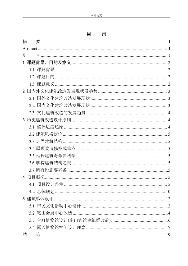 本科论文目录摘要…Abstract.…引1课题背景、目的及意义1.1课题背景21.3课题意义22国内外文化建筑改造发展现状及趋势32.1国外文化建筑改造发展现状2.2国内文化建筑改造发展现状32.3文化建筑改造的发展趋势3历史建筑改造设计原则…43.1整体适度还原3.2建筑风格定位…53.3巩固建筑结构53.4屋顶改造修补成重点53.5延长建筑寿命要科学3.6解构建筑结构之美3.7所有设施要齐备4项目概况…54.1项目设计条件…4.2总体规划105建筑单体设计125.1市民文化活动中心设计5.2鞍山会展中心改造145.3台町博物馆设计(东山宾馆建筑群改造).165.4露天博物馆空间设计理念结论…本科论文参考文献20致22本科论文摘要鞍山台町作为省级历史文化保护街区,她所承载的不仅仅是可见可触摸的物质空间方面,更多的是鞍山的时代记忆和鞍山人民的共同情感。因此,如何在建筑改造中重塑场所精神,激发鞍山人民的共情,将台町文化用建筑的语言进行叙述成为本次课题研究的重点。本文针对这些问题,对不同品质及等级的建筑提出了不同的解决办法。在遵循威尼斯宪章城市更新原则的基础上,挖掘其内涵,引入“非为保存而保护,实为创造而修复”的改造原则,从宏观、中观、微观三个层次进行递进:从城市角度分析区域角色以及和城市的关系,以达到共生共存,功能互补的目的;中观对台町地区现状进行梳理,进而延伸至场地一一上台町;从微观层面对场地街道尺度、交通问题、建筑功能等问题进行具体处理,并对场地内建筑、景观以及交通等现状进行梳理并提取问题,进而解决问题,以此触发整个区域激活。在建筑设计中,依托上台町场地内鞍山会展中心和东山宾馆建筑群的特有建筑风貌,分别将其功能进行补充和置换,并将东山宾馆一、二、四号楼改造为台町历史博物馆。在中台町场地通过老建筑加建,将已经废弃的当社图书馆改造成为市民文化中心。室外空间成为露天博物馆,让老建筑进行“文化自述”关键词:建筑改造:文化建筑:博展空间;观演空间