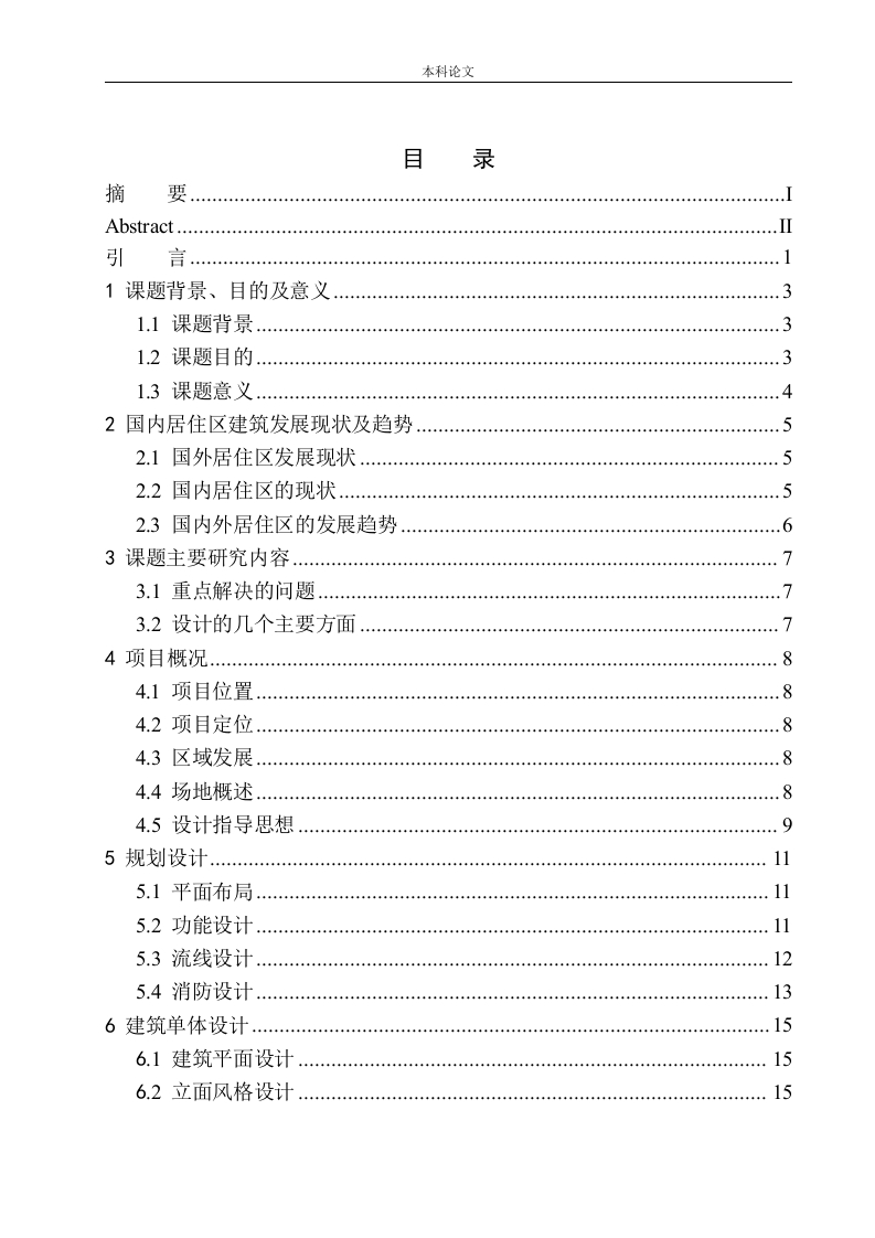 本科论文目录摘Abstract..引言1课题背景、目的及意义31.1课题背景1.2课题目的…1.3课题意义2国内居住区建筑发展现状及趋势2.1国外居住区发展现状.…2.2国内居住区的现状2.3国内外居住区的发展趋势.63课题主要研究内容.…3.1重点解决的问题3.2设计的几个主要方面4项目概况.4.1项目位置4.2项目定位84.3区域发展…4.4场地概述4.5设计指导思想95规划设计.…115.1平面布局.115.2功能设计115.3流线设计125.4消防设计136建筑单体设计156.1建筑平面设计…156.2立面风格设计15本科论文6.3生态设计16结参考文献18致20本科论文摘要在住房环境日益改善的今天,如何为居民们提供和建造出较为舒适的建筑居住区设计愈发引起了人们的关注。功能问题及经济问题是居住区目前最基本的问题。在居住区规划及建设时,要考虑到居民娱乐方面及起居生活等进行全方面的考虑。本次课题在通过对比参考大量国内外的居住区规划设计前提下,在建筑事业稳定发展的今天,人们的居住环境理当得到相应的进步,需要规划设计人员认清当前居住建筑设计中的不足,遵循其原有体现下的原则,以人为中心的最高指导原则,到达不同功能同步运转的创建居住区的目的,同时,总结国内外居住区设计的优势、过程和不足,有很多小镇风情景观良好注重外边,风景优美自然风光流露,且国外欧美发达国家发展现代建筑发展早,现代住宅区建筑规划相对成熟,相比下国内有许多不足之处。功能完善,侧重外表、但生态性不够强、人造景观与自然与融合不够自然。本毕业设计拟建设一个居住区。本项目的建筑类型为居住类建筑。根据实地调研,发现项目周边有大量住宅区,年轻人数量多,且许多年轻人曾在项目周边地域的企业共工作过,与项目的地缘关系紧密。本毕业设计用地位于大东区沈阳望花城中村-9地块,周边配套完善,为保证与人们的生活方式相契合,达成规范和规定以及任务书的要求:本小区规划主体建筑为住宅建筑,为配合主体建筑本园区设计幼儿园,商业建筑,花园,公共广场以及大量配套公共娱乐服务空间,居家养老服务,社区公共用房也包括公厕、生活垃圾容器间等配套设施。本次设计的目的在于了解居住区与周边地貌的关系等问题,提高构思设计技术、表达设计意图的能力、思考和综合分析和解决问题的能力等、专业的设计素质等。能达到在了解居住区的设计目的后,达到通过规划设计后让更多住户拥有较好的朝向景观空间,创造一个安逸美好的自然居住环境,完成人与自然相互和谐的目的。关键词:居住区生活方式规划设计居住类建筑