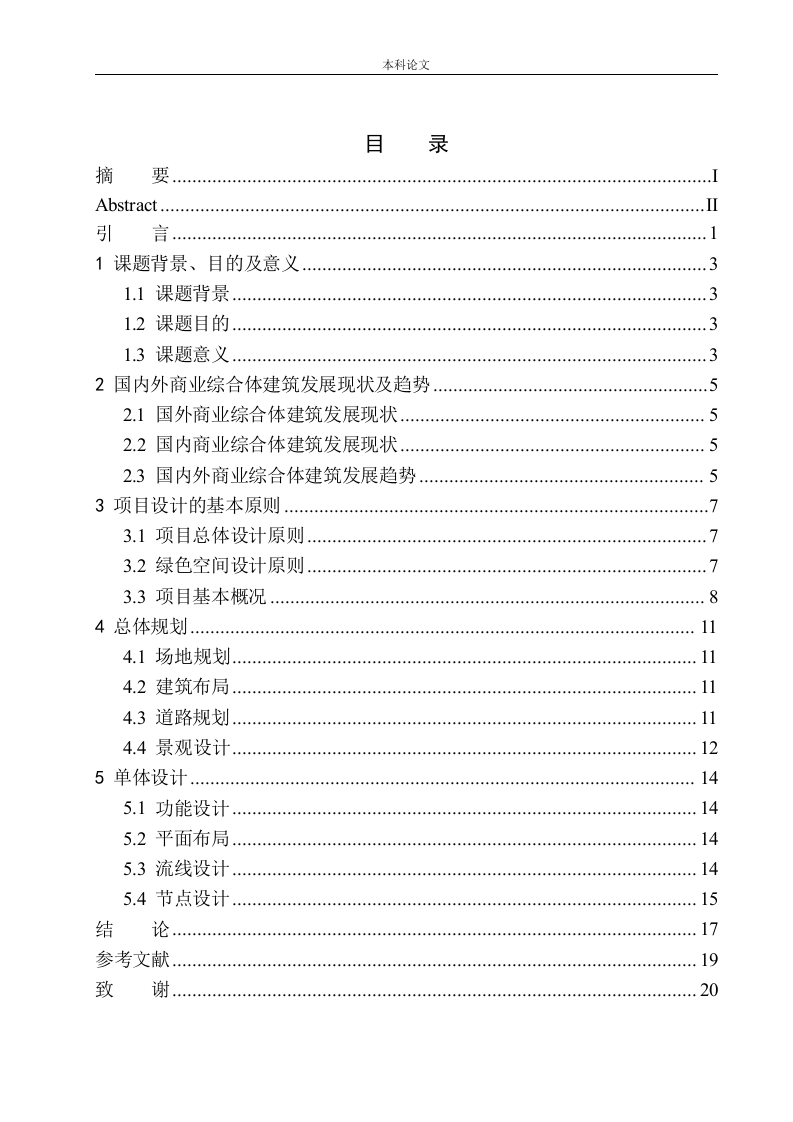 本科论文目录摘要…Abstract.…引言1课题背景、目的及意义1.2课题目的.1.3课题意义32国内外商业综合体建筑发展现状及趋势52.1国外商业综合体建筑发展现状2.2国内商业综合体建筑发展现状52.3国内外商业综合体建筑发展趋势3项目设计的基本原则.…3.1项目总体设计原则73.2绿色空间设计原则73.3项目基本概况84总体规划…114.1场地规划114.2建筑布局.…114.3道路规划114.4景观设计125单体设计.145.1功能设计145.2平面布局145.3流线设计145.4节点设计.…1517参考文献…致20本科论文摘要近些年来,我国正逐渐进入快速发展化社会,随着城市人口数量的增长,已经出现土地资源的短缺渐渐无法满足需求的现状问题。在新时期的发展需求下,城市商业综合体建筑景观系统的整体质量的舒适度成为目前人们十分关注的话题。商业综合体建筑在功能上较为特殊,受众又是需求不断增加的群体,因此需要在设计上做到更加完善,更加注重考虑受众的心理需求和生活习惯,为居民提供较为健康舒适的商办环境。此时,将绿色生态理念引入,提高城市商业综合体建筑的设计效果。本次课题在通过对比分析一些典型的国外成功的商业模式的前提下,将其相比于中国传统的商业模式,同时,指出一些国外商业模式中值得我们借鉴和吸收的经验,以此来探索适合我国社会实际情况的中国特色的商业模式。以及对从场地规划、人际交往空间、办公空间、商业空间、建筑通行空间以及等角度进行探索,来体现生态化绿色空间的理念。本文针对商业建筑的建筑布局、道路规划、活动场地、建筑功能、流线和重要空间节点包括屋顶花园、中庭和下沉式广场等方面探讨对于商业建筑的设计的相关问题。由于人们生活压力大,节奏快,对商业综合体一些细节设计的要求越来越高。因此要综合考虑,合理规划,从城市居民的实际需求出发进行商业综合体建筑的全面设计关键词:商业综合体:绿色空间:景观生态本科论文AbstractIn recent years,China is gradually entering a rapid development society.With the growth of urban population,there has been a shortage of land resourcesthat can not meet the needs of the current situation.In the new era of development,the comfort of the overall quality of the urban commercial complex buildinglandscape system has become a topic of great concern.The function of commercialcomplex building is more special,and the audience is a group with increasingdemand.Therefore,it needs to be more perfect in the design,pay more attention tothe psychological needs and living habits of the audience,and provide a morehealthy and comfortable business environment for the residents.At this time,theconcept of green ecology is introduced to improve the design effect of urbancommercial complex buildings.On the premise of comparative analysis of sometypical successful foreign business models,this paper compares them withtraditional Chinese business models,and points out some experience that we canlearn from and absorb from foreign business models,so as to explore the businessmodel with Chinese characteristics suitable for the actual situation of our society.As well as from the site planning,interpersonal space,office space,commercialspace,building access space and other angles to explore,to reflect the concept ofecological green space.In this paper,the layout of commercial buildings,road planning,activity sites,building functions,streamline and important space nodes,including the roofgarden,atrium and Sunken Plaza,are discussed.Due to the high pressure and fastpace of people's life,the requirements for the detailed design of commercialcomplex are higher and higher.Therefore,the comprehensive design ofcommercial complex building should be carried out according to the actual needsof urban residents.Keywords:commercial complex;green space;landscape ecology