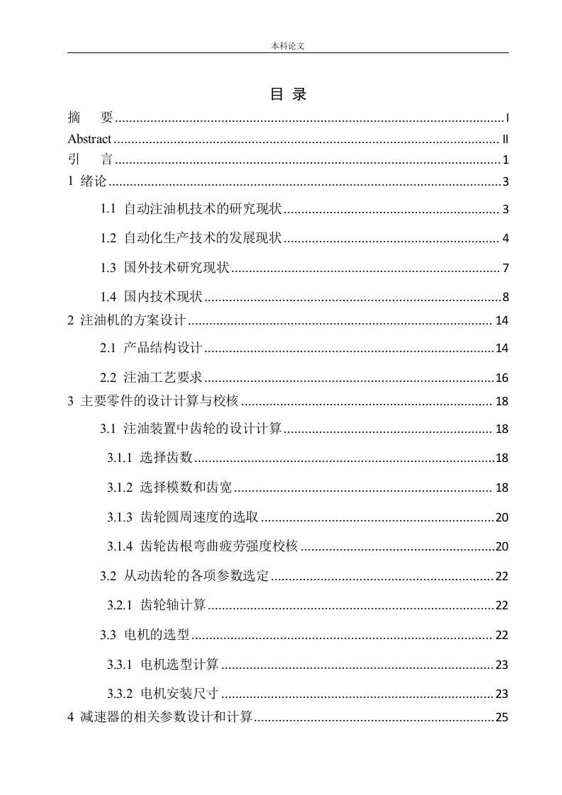 本科论文目录摘Abstract....引言31.1自动注油机技术的研究现状.31.2自动化生产技术的发展现状1.3国外技术研究现状.…1.4国内技术现状.…2注油机的方案设计..142.1产品结构设计.…2.2注油工艺要求.3主要零件的设计计算与校核…183.1注油装置中齿轮的设计计算.…3.1.1选择齿数.….183.1.2选择模数和齿宽.…3.1.3齿轮圆周速度的选取.3.1.4齿轮齿根弯曲疲劳强度校核3.2从动齿轮的各项参数选定…223.2.1齿轮轴计算.…223.3电机的选型223.3.1电机选型计算233.3.2电机安装尺寸4减速器的相关参数设计和计算..25本科论文4.1减速器的相关参数计算254.1.1输入轴254.1.2输出轴264.1.3减速器中齿轮的设计计算284.2减速器中行星齿轮传动强度的计算与验证.314.2.1减速器中行星齿轮抗弯强度的计算与验证..…314.2.2齿轮配合用键的校验324.2.3轴承选型3335参考文献35致谢…39本科论文摘要随着我国汽车生产水平的不断提高,塑料微阻尼器需求量更大,塑料微型阻尼器大量应用于汽车制造,家具生产,仪器生产,家用电器等行业,为防止运动部件的开关震动而导致损坏接头表面。塑料微阻尼器具有成本低,产量大的特点,随着自动化在制造业越来越受重视,高C精度微量注油技术也备受关注,阻尼器注油是阻尼器生产的重要环节,也是自动化生产必不可少的一部分,人工注油生产是现今塑料微阻尼器的主要生产方式,这种生产方式效率低且报废率高,劳动强度大成本高。故而,本文的研制了一种高效的塑料微阻尼器自动注油装置,并根据塑料微阻尼器的生产特点,研究了其高粘度测微计注油技术。主要研究工作和成果如下:以某公司生产的塑料微阻尼器为对象,在调研了小零件注油技术在国内外的发展状况后,根据技术参数及注油工艺,并根据塑料微阻尼器的结构对自动注油技术进行了整改并优化。详细研究了多工位塑料微阻尼器自动注油技术总体方案中涉及的关键技术。微量计量高粘度注油技术:由于高粘度阻尼油的流动性比较差,通过微量计量方法并不断进行实验检测。本机实现了输送量和体积微量计量100万cs阻尼油的0一5g微量注入功能。本文研发的齿轮式注油机机构具备生产效率高、注油生产过程连续、生产产品质量高等优势,大大降低人工劳动强度、生产成本也得到降低。本文所研究的齿轮式注油机机构,也可广泛延伸使用于一些其它微小零部件的注油生产。关键字:自动注油机设计:微量注油技术:高粘度注油:微小部件注油