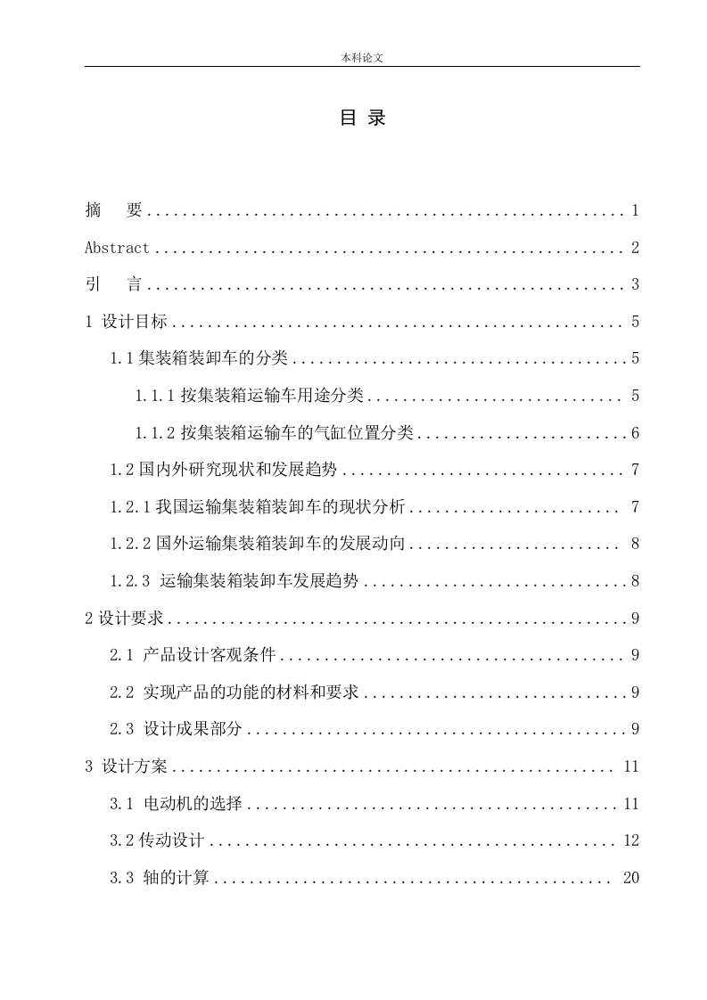 本科论文目录摘1Abstract .2引言351.1集装箱装卸车的分类.·.1.1.1按集装箱运输车用途分类..51.1.2按集装箱运输车的气缸位置分类..1.2国内外研究现状和发展趋势...1.2.1我国运输集装箱装卸车的现状分析...1.2.2国外运输集装箱装卸车的发展动向....81.2.3运输集装箱装卸车发展趋势.·2.1产品设计客观条件....92.2实现产品的功能的材料和要求113.1电动机的选择..·111220本科论文3.3.1轴的选取..2020224三维建模245整体渲染36结37致3839本科论文摘要现阶段接触的集装箱搬运过程中,大都依靠其他机械辅助装卸,而且很多情况下,不仅使集装箱的转运效率大大降低,还在转运和装卸的过程中产生大额的装卸费用,这些不利因素对于整个行业的制约极其明显。目前国外正向着提高效率、自动操作、装卸灵活轻便,专业化方向发展。我想设计一种方便快捷,省时省力的一种集装箱装卸车来改善这一缺点。改变以往传统集装箱装卸需要多人配合的局限性,节约人力资源,减少企业投入,提高效率。这个设计的装卸车功能既能够装卸地面上的集装箱,也能够装卸车上的集装箱,需要明确集装箱装卸车的作业步骤,确保装卸车过程安全可控,装卸过程不偏载不偏重,确保安全。