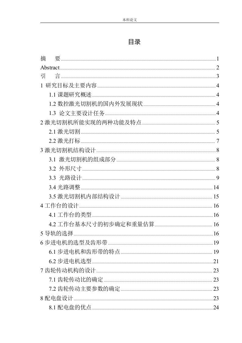 本科论文目录摘要Abstract2引言31研究目标及主要内容4..1.1课题研究概述41.2数控激光切割机的国内外发展现状41.3论文主要设计任务2激光切割机所能实现的两种功能及特点52.1激光切割52.2激光打标3激光切割机结构设计83.1激光切割机的组成部分3.2外形尺寸83.3光路设计93.4光路调整....143.5激光切割机内部结构设计154工作台的设计164.1工作台的类型164.2工作台基本尺寸的初步确定和重量估算................................165导轨的选择166步进电机的选型及齿形带196.1步进电机和齿形带的特点196.2步进电机选型217齿轮传动机构的设计.…237.1齿轮传动比的确定237.2齿轮传动主要参数的确定238配电盘设计238.1配电盘的优点24本科论文8.2配电盘布局249激光管和激光电源的选择259.1二氧化碳激光管的工作原理及特点259.2二氧化碳激光管功率的选择269.3激光电源的选择2710零件的表面处理272911.1机床控制系统总体方案2911.2激光切割机控制系统选择2911.3泊楚CYpTube激光切割控制系统功能介绍3012水泵、气泵、风机3012.1水泵的作用及选择.....3012.2气泵的作用及选择3112.3风机的作用及选择3113激光切割机安全操作注意事项31结论............................33参考文献34致谢.....................................................36本科论文本科生毕业设计(论文)独创性声明本人声明所呈交的毕业设计(论文)是本人在导师指导下进行的研究工作及取得的研究成果,除了文中特别加以标注和致谢的地方外,本论文中没有抄袭他人研究成果和伪造数据等行为。与我一同工作的同志对本研究所做的任何贡献均已在论文中作了明确的说明并表示谢意。设计(论文)作者签名:日期:本科生毕业设计(论文)使用授权声明沈阳城市学院有权保留并向国家有关部门或机构送交毕业设计(论文)的复印件和磁盘,允许毕业设计(论文)被查阅和借阅。本人授权沈阳城市学院可以将本科毕业设计(论文)的全部或部分内容编入有关数据库进行检索,可以采用影印、缩印或其他复印手段保存、汇编毕业设计(论文)。设计(论文)作者签名:日期:指导教师签名:日期: