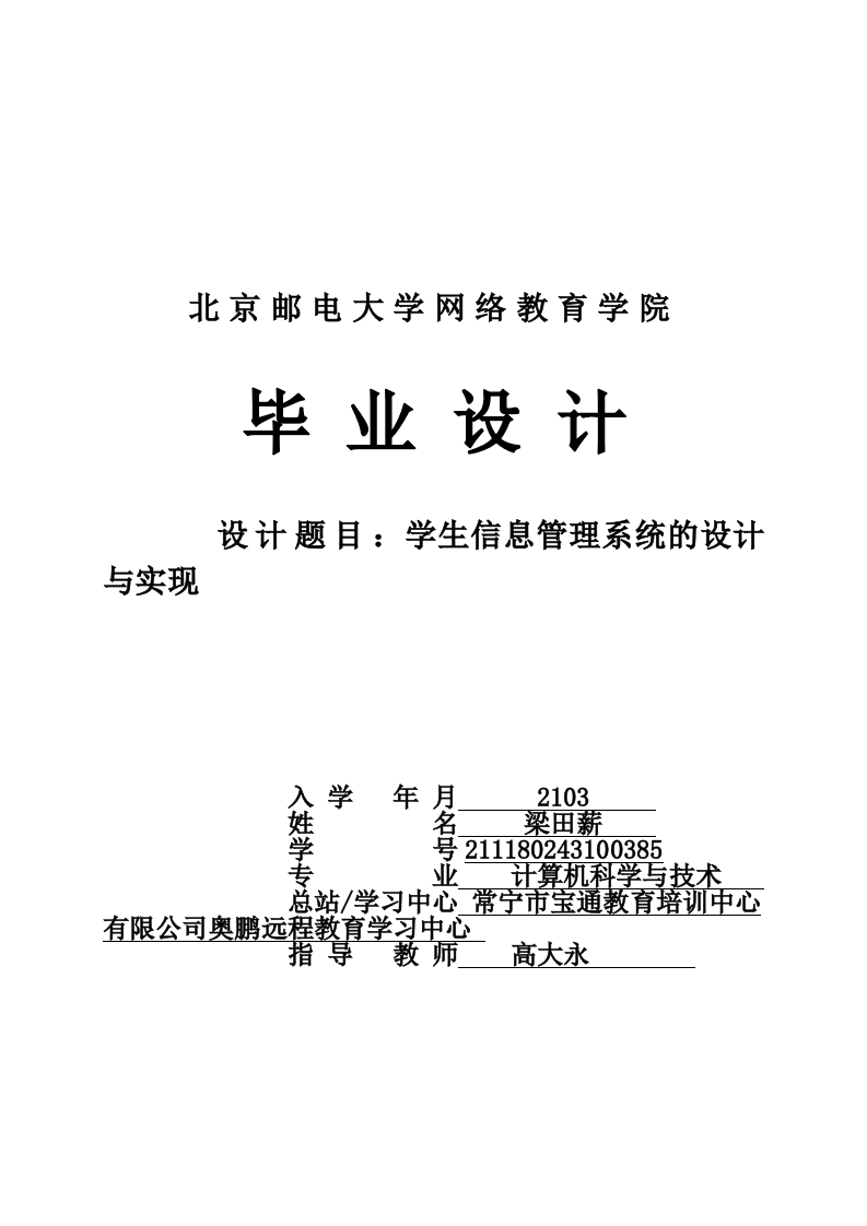 北京邮电大学网络教育学院毕业设计设计题目:学生信息管理系统的设计与实现学年2103梁田薪211180243100385业计算机科学与技术有限公司奥鹏远程教育学习中心高大永完成时间2022年12月15北京邮电大学网络教育学院本科毕业设计(论文)诚信声明本人声明所呈交的毕业设计(论文),题目《现代物流业务营销策略的研究》是本人在指导教师的指导下,独立进行研究工作所取得的成果。尽我所知,除了文中特别加以标注和致谢中所罗列的内容以外,论文中不包含其他人已经发表或撰写过的研究成果,也不包含为获得北京邮电大学网络教育学院或其他教育机构的学位或证书而使用过的材料。论文与资料若有不实之处,本人承担一切相关责任。本人签名:日期:2022.12.25