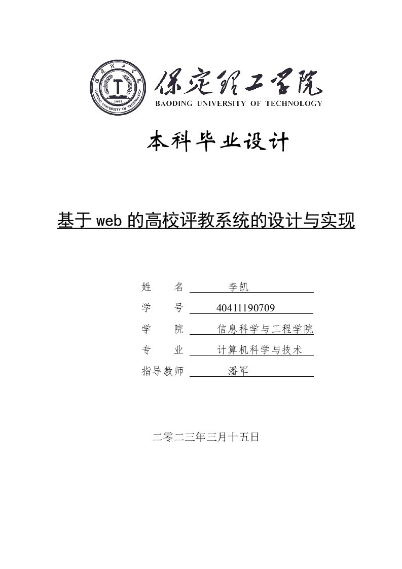 BAODING UNIVERSITY OF TECHNOLOGY本科毕业设计基于web的高校评教系统的设计与实现姓名李凯学40411190709学院信息科学与工程学院专业计算机科学与技术指导教师潘军二零二三年三月十五日学位论文原创性声明本人所提交的学位论文是在指导教师指导下所取得的原创性成果。除文中已经注明引用的内容外,本论文未剽窃、抄袭他人的学术观点、思想和成果,未篡改研究数据。如有违规行为发生,本人愿承担一切责任,接受学校处理。论文作者(签名)::2023年5月30日2023年5月30日学位论文版权使用授权书本学位论文作者完全了解中国保定理工学院有权保留并向国家有关部门或机构送交学位论文的复印件和磁盘,允许论文被查阅和借阅。本人授权保定理工学院可以将学位论文的全部或部分内容编入有关数据库进行检索,可以采用影印、缩印或其它复制手段保存、汇编学位论文。保密的学位论文在解密后适用本授权书。指导教师(签名):善手2023年5月30日2023年5月30日摘要随着我国教育培训体制的不断改革,特别是学分制和选课制的推行,学习活动的日常管理变得更加困难和复杂,有效的学习质量评估手段,成为保证和监控学习质量的关键条件之一。计算机取代人工记录评估结果和统计评价,可以减少学习管理人员繁琐的统计工作,可以使学习质量评估工作灵活、客观、公正,使学习质量评估不受地域和时间的限制。本论文在原有学习管理信息系统的基础上,开发了高校教学评价系统,完善和丰富了网上教学质量评价和反馈资源,逐步构建了一个新的网上教学质量评价平台,结合Wb的优势和普及。采用JAVA开发语言、MYSQL数据库开发完成,为用户提供了一个界面友好的高校评教系统本论文首先对基于Wb的高校评教系统进行需求分析,从系统开发环境、系统目标、设计流程、功能设计等几个方面进行系统的总体设计,开发实现了基于Wb的高校评教系统,主要实现注册登录、课程管理、授课管理、学生评教等等功能通过测试,测试结果证明该系统界面友好、功能完善,具有庞大的潜能用户群体和较广的应用。关键词:高校评教系统:JAVA开发语言:MYSQL数据库:Web