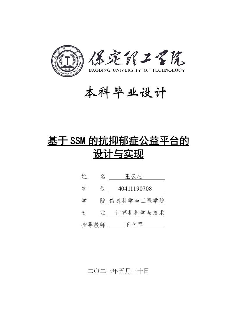 BAODING UNIVERSITY OF TECHNOLOGY本科毕业设计基于SSM的抗抑郁症公益平台的设计与实现姓名王云壮学号40411190708学院信息科学与工程学院专业计算机科学与技术指导教师王立军二O二三年五月三十日学位论文原创性声明本人所提交的学位论文是在指导教师指导下所取得的原创性成果。除文中已经注明引用的内容外,本论文未剽窃、抄袭他人的学术观点、思想和成果,未篡改研究数据。如有违规行为发生,本人愿承担一切责任,接受学校处理。2023年5月30日2023年5月30日学位论文版权使用授权书本学位论文作者完全了解保定理工学院有权保留并向国家有关部门或机构送交学位论文的复印件和磁盘,允许论文被查阅和借阅。本人授权保定理工学院可以将学位论文的全部或部分内容编入有关数据库进行检索,可以采用影印、缩印或其它复制手段保存、汇编学位论文。保密的学位论文在解密后适用本授权书。2023年5月30日2023年5月30日摘要抑郁症是一种常见的心理疾病,在现代社会中,抑郁症患者数量呈现不断上升的趋势。随着抑郁症人数的不断增加,各种形式的抗抑郁症公益活动也在不断展开。本文提出了一种基于SSM的抗抑郁症公益平台的建设方案,旨在为广大抑郁症患者提供更好的帮助和更全面的支持。该平台采用了Java语言编写,使用SSM框架和MySQL数据库进行开发,并结合MVC设计模式、Bootstrap框架和jQuery库进行优化,以使平台具有更好的用户体验和管理效果。该系统具有用户登录注册、用户信息管理、医生信息管理、用户自测管理、预约医生管理、资源分享管理等功能。通过本文的设计和实现,抗抑郁症公益平台得以顺利建立起来。同时,该平台还具有优秀的用户体验和管理功能,为抑郁症患者提供了全面和优质的支持和服务,提高了公益活动的效率,也增强了抑郁症患者的治疗信心和治疗效果。关键词:My SQL数据库;Java语言;SSM框架;公益平台