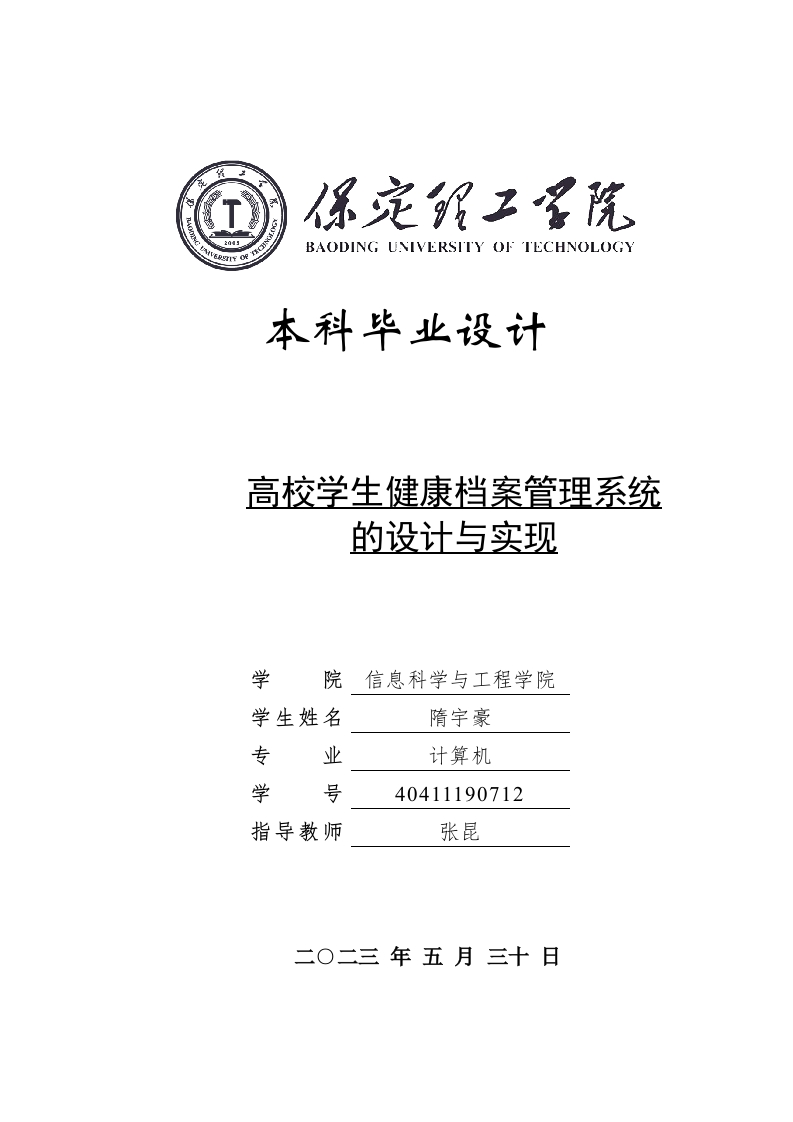 BAODING UNIVERSITY OF TECHNOLOGY本科毕业设计高校学生健康档案管理系统的设计与实现学院信息科学与工程学院学生姓名隋宇豪专业计算机学号40411190712指导教师张昆二O二三年五月三十日学位论文原创性声明本人所提交的学位论文是在指导教师指导下所取得的原创性成果。除文中已经注明引用的内容外,本论文未剽窃、抄袭他人的学术观点、思想和成果,未篡改研究数据。如有违规行为发生,本人愿承担一切责任,接受学校处理。指导教师确认(签名):2023年5月30日2023年5月30日学位论文版权使用授权书本学位论文作者完全了解保定理工学院有权保留并向国家有关部门或机构送交学位论文的复印件和磁盘,允许论文被查阅和借阅。本人授权保定理工学院可以将学位论文的全部或部分内容编入有关数据库进行检索,可以采用影印、缩印或其它复制手段保存、汇编学位论文。保密的学位论文在解密后适用本授权书。指导教师(签名):2023年5月30日2023年5月30日摘要随着社会的发展和人们生活水平的提高,人们越来越重视身体健康。然而,慢性疾病的日益增多使人们认识到积极管理健康的重要性。因此,一款实用的综合评估个人健康状况的健康管理软件是非常必要的。本文使用Java语言和SpringBoot框架构建后端,使用Vue进行前端编写,使用MySQL数据库和Navicat数据库工具,并选择DEA作为开发工具来开发和设计医疗管理系统。该系统具有个性化、及时、方便和互动的特点,并该系统的功能有班级信息管理,体检数据管理,健康评估管理,用要提醒管理,体检档案管理,系统管理。方便用户实时记录和查询个人健康信息,可以帮助用户养成进行自我健康管理的习惯。关键词:MySQL数据库;Java语言;Vue:Springboot框架