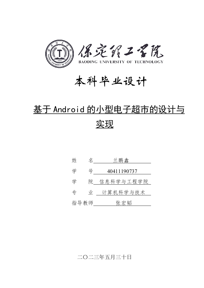 BAODING UNIVERSITY OF TECHNOLOGY本科毕业设计基于Android的小型电子超市的设计与实现姓名兰鹏鑫学号40411190737学院信息科学与工程学院专业计算机科学与技术指导教师张宏韬二O二三年五月三十日学位论文原创性声明本人所提交的学位论文是在指导教师指导下所取得的原创性成果。除文中已经注明引用的内容外,本论文未剽窃、抄袭他人的学术观点、思想和成果,未篡改研究数据。如有违规行为发生,本人愿承担一切责任,接受学校处理。指导教师确认(签名):2023年5月30日2023年5月30日学位论文版权使用授权书本学位论文作者完全了解保定理工学院有权保留并向国家有关部门或机构送交学位论文的复印件和磁盘,允许论文被查阅和借阅。本人授权保定理工学院可以将学位论文的全部或部分内容编入有关数据库进行检索,可以采用影印、缩印或其它复制手段保存、汇编学位论文。保密的学位论文在解密后适用本授权书。论文作者(签名):指导教师(签名):2023年5月30日2023年5月30日摘要在中国,由于超市业的持续发展,对信息的储存与处理提出了更高的要求,为了更好地参与到市场的竞争中来,必须要有更高效率的处理与管理手段。所以,加速超市的信息化进程势在必行,因此设计一个基于Andriod的小型电子超市符合当下需求。本系统主要采用的是Java语言,采用了SpringBoot框架来构建和编写,并将Vue作为前端技术来编写,还使用MySQL作为数据库,在此基础上完成了小型电子超市系统。系统在用户完成注册登录之后,可以按商品分类或者商品品牌两种分类方式进行搜索:在选择好心仪的商品以后可以添加到购物车购买也可以收藏,同时在该界面也可进行订单查看和在线客服咨询。所有功能经过测试均可正常运行,有一定使用前景和经济价值。关键词:MySQL数据库;Java语言;Springboot框架