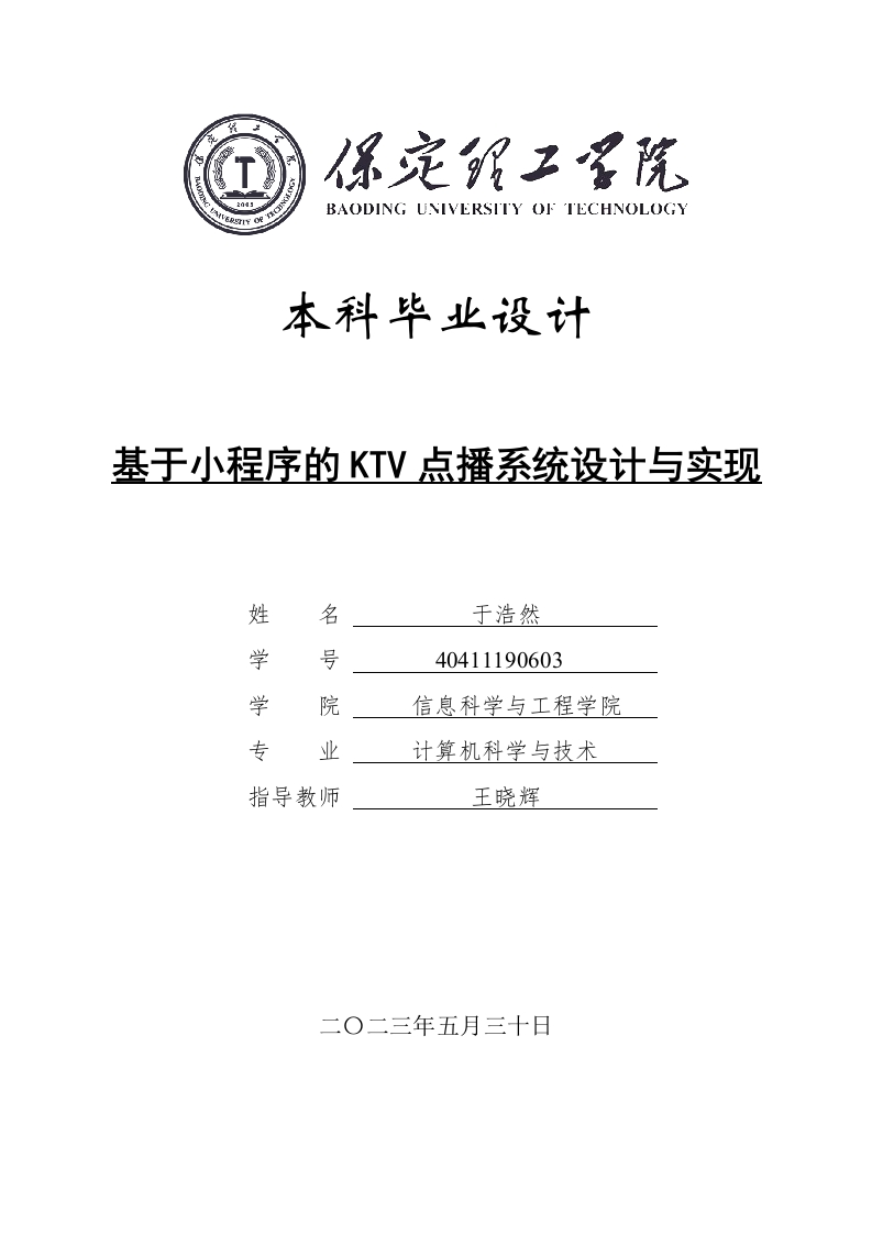 定BAODING UNIVERSITY OF TECHNOLOGY本科毕业设计基于小程序的KTV点播系统设计与实现姓名于浩然学号40411190603学院信息科学与工程学院专业计算机科学与技术指导教师王晓辉二O二三年五月三十日学位论文原创性声明本人所提交的学位论文是在指导教师指导下所取得的原创性成果。除文中已经注明引用的内容外,本论文未剽窃、抄袭他人的学术观点、思想和成果,未篡改研究数据。如有违规行为发生,本人愿承担一切责任,接受学校处理。本声明的法律后果由本人承担。论文作者(签名):于浩然2023年5月30日2023年5月30日学位论文版权使用授权书本学位论文作者完全了解保定理工学院有权保留并向国家有关部门或机构送交学位论文的复印件和磁盘,允许论文被查阅和借阅。本人授权保定理工学院可以将学位论文的全部或部分内容编入有关数据库进行检索,可以采用影印、缩印或其它复制手段保存、汇编学位论文。保密的学位论文在解密后适用本授权书。论文作者(签名):于浩然2023年5月30日2023年5月30日摘要为满足消费者需求,进一步提升和加快娱乐行业管理信息化进程,根据我国娱乐行业的特点和需求,结合以往娱乐软件开发经验,以科学的娱乐行业管理标准为抓手,将开发一个实用、高效、高灵活性和可扩展性的KTV点播系统。系统开发使用的技术主要有Java语言和微信小程序等,前后端系统连接主要通过Ajx,选用MySQL数据库存储系统数据,数据库内容和数据可视化界面的操作通过JQuery插件完成,系统的部署和发布在Tomcat服务器上完成。该系统包含了用户信息管理、歌曲信息管理、歌曲类别管理、明星信息管理、酒水食品信息管理以及KTV点歌管理等功能,为用户提供了便捷的服务。经过严格的测试,证明这个系统的界面友好,功能完善,有很高的使用价值,可以运用到更多场景中。关键词:KTV点播系统;Java语言;MySQL数据库