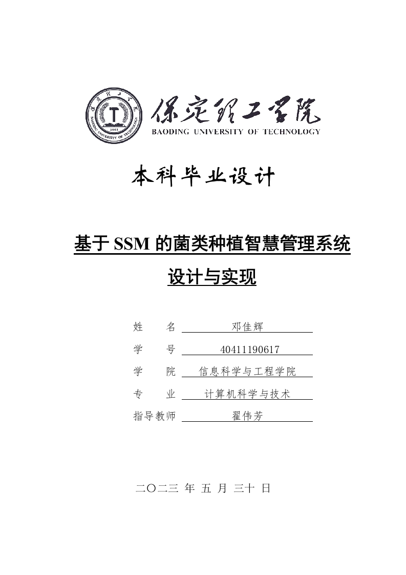 TBAODING UNIVERSITY OF TECHNOLOGY本科毕业设计基于SSM的菌类种植智慧管理系统设计与实现姓名邓佳辉学号40411190617学院信息科学与工程学院专业计算机科学与技术指导教师翟伟芳二O二三年五月三十日学位论文原创性声明本人所提交的学位论文是在指导教师指导下所取得的原创性成果。除文中已经注明引用的内容外,本论文未剽窃、抄袭他人的学术观点、思想和成果,未篡改研究数据。如有违规行为发生,本人愿承担一切责任,接受学校处理。本声明的法律后果由本人承担。论文作者(签名):风予佳手2023年5月30日2023年5月30日学位论文版权使用授权书本学位论文作者完全了解保定理工学院有权保留并向国家有关部门或机构送交学位论文的复印件和磁盘,允许论文被查阅和借阅。本人授权保定理工学院可以将学位论文的全部或部分内容编入有关数据库进行检索,可以采用影印、缩印或其它复制手段保存、汇编学位论文。保密的学位论文在解密后适用本授权书。论文作者(签名):乃佳军2023年5月30日2023年5月30日摘要目前大部分农业经营都要手工作业完成,消耗大量人力物力,近年,因为网络技术的兴起,迫切需要对农业经营进行科学的管理,以此提高农产品的质量和产量。以当今社会对菌类种植智慧管理系统的需求现状为背景,本管理系统的开发环境操作系统采用了Windows系统,以Java语言为基础,主要使用了DEA开发工具,服务器使用了Tomcat,.服务器使用了SpringBoot框架,开发前端使用了Vue,后台数据库使用了MySQL数据库用于数据存储。系统主要实现了用户注册登录、菌类类别管理、菌类信息管理、记录信息管理、专业指导管理、天气预报管理、菌棚信息管理、控制信息管理等,管理员可以完成对菌类种植相关的信息进行整理和发布,农技人员可以实现相关信息的查看及预览,大大提高了农技人员的工作效率。系统测试采用黑盒测试,整个系统在测试过程中,都能很好的把数据呈现给农技人员,从系统的功能和系统的使用上,都能达到预计结果。关键词:菌类种植智慧管理系统;MySQL数据库;Java语言