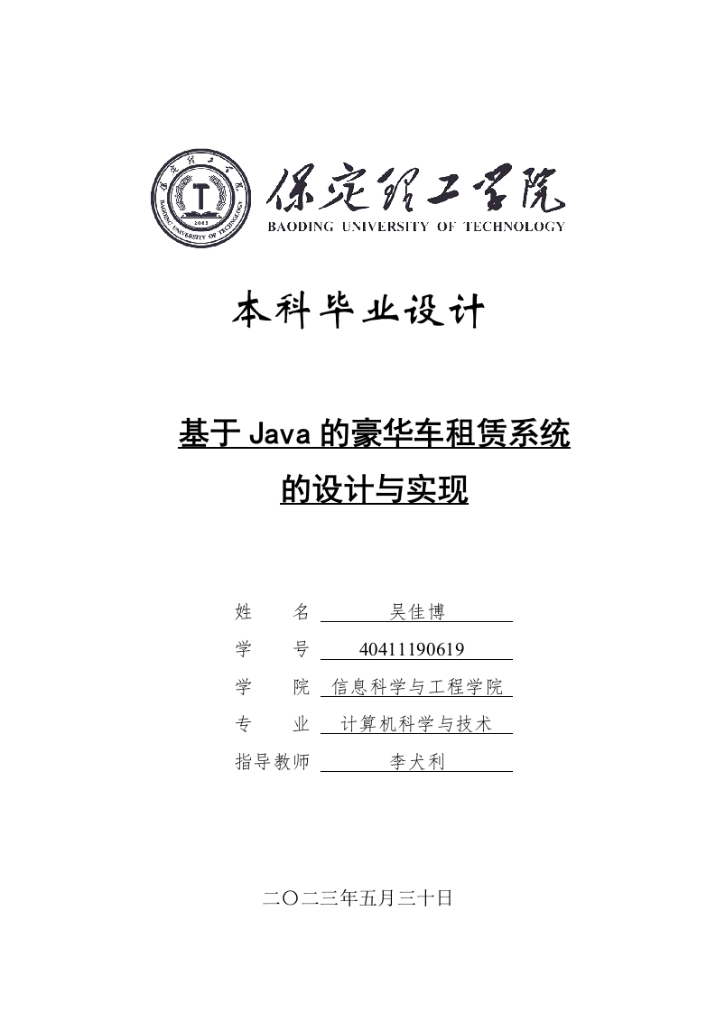 BAODING UNIVERSITY OF TECHNOLOGY本科毕业设计基于Java的豪华车租赁系统的设计与实现姓名吴佳博学40411190619学院信息科学与工程学院专业计算机科学与技术指导教师李犬利二O二三年五月三十日学位论文原创性声明本人所提交的学位论文是在指导教师指导下所取得的原创性成果。除文中已经注明引用的内容外,本论文未剽窃、抄袭他人的学术观点、思想和成果,未篡改研究数据。如有违规行为发生,本人愿承担一切责任,接受学校处理。论文作者(签名):指导教师确认(签名):2023年5月30日2023年5月30日学位论文版权使用授权书本学位论文作者完全了解保定理工学院有权保留并向国家有关部门或机构送交学位论文的复印件和磁盘,允许论文被查阅和借阅。本人授权保定理工学院可以将学位论文的全部或部分内容编入有关数据库进行检索,可以采用影印、缩印或其它复制手段保存、汇编学位论文。保密的学位论文在解密后适用本授权书。论文作者(签名):指导教师(签名):2023年5月30日2023年5月30日摘要随着国内经济的发展,车辆租赁市场日益扩大,车辆租赁企业的业务量也与日俱增。如何提高管理水平,充分抓住发展机遇,实现企业的进一步发展已成为企业面临的重要课题。本系统正是基于这一现实背景,首先对基于Java的豪华车租赁系统进行了需求分析,然后对开发环境、目标、设计流程、功能模块等多个方面进行系统的设计,最终开发实现了基于Java的豪华车租赁系统。本系统采用Java开发语言、MySQL数据库开发完成,为用户提供了一个界面友好的豪华车租赁平台。本系统实现了注册登录、租赁车辆管理、用户信息管理、订单管理、车辆推荐、联系我们、购物车、支付管理、取车管理、还车管理等功能。经过对系统进行测试,表明系统功能较为全面,系统界面具有一定的美观性,对于潜在用户群体有着更广泛的使用前景。