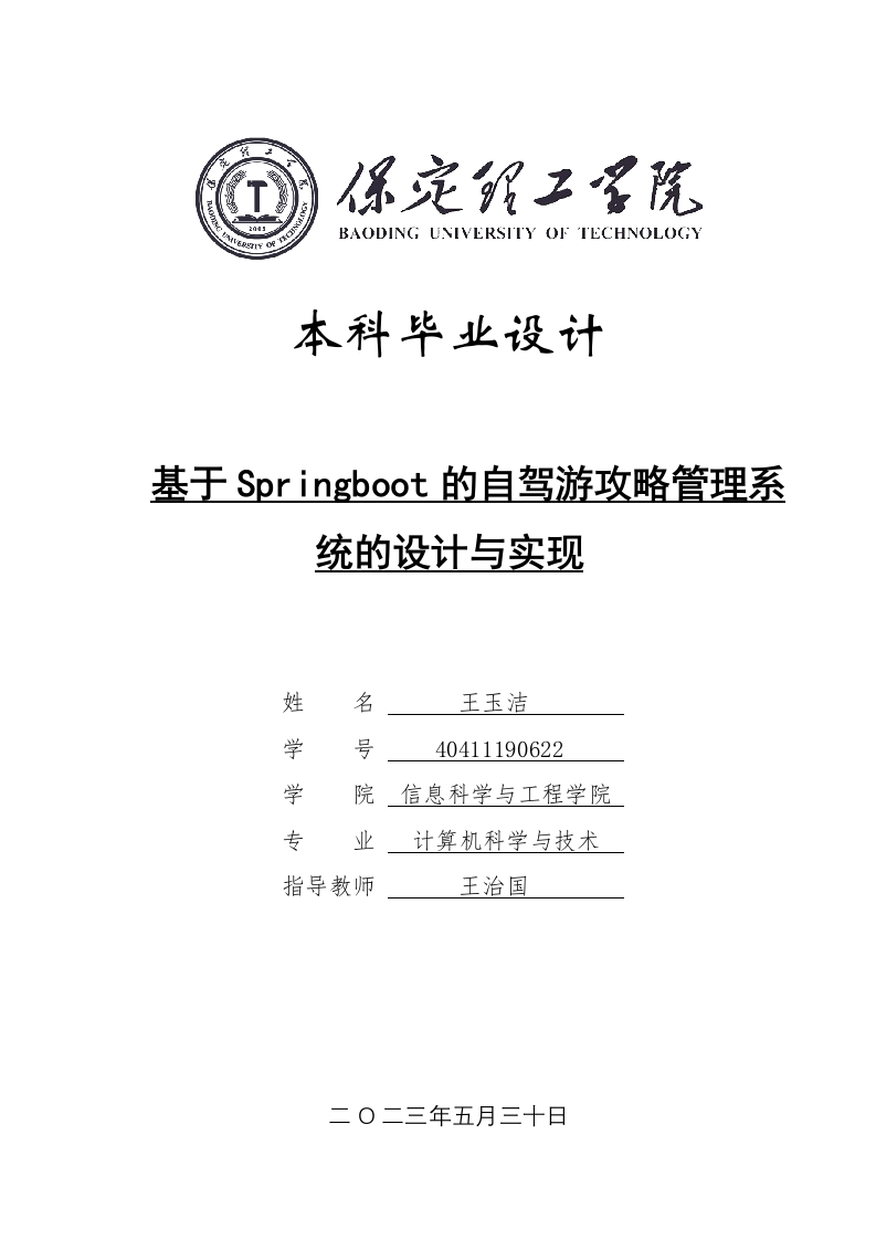 BAODING UNIVERSITY OF TECHNOLOGY本科毕业设计基于Spr ingboot的自驾游攻略管理系统的设计与实现姓名王玉洁学号40411190622学院信息科学与工程学院专业计算机科学与技术指导教师王治国二0二三年五月三十日学位论文原创性声明本人所提交的学位论文是在指导教师指导下所取得的原创性成果。除文中己经注明引用的内容外,本论文未剽窃、抄袭他人的学术观点、思想和成果,未篡改研究数据。如有违规行为发生,本人愿承担一切责任,接受学校处理。本声明的法律后果由本人承担。论文作者(签名):指导教师确认(签名):2023年5月30日2023年5月30日学位论文版权使用授权书本学位论文作者完全了解保定理工学院有权保留并向国家有关部门或机构送交学位论文的复印件和磁盘,允许论文被查阅和借阅。本人授权保定理工学院可以将学位论文的全部或部分内容编入有关数据库进行检索,可以采用影印、缩印或其它复制手段保存、汇编学位论文。保密的学位论文在解密后适用本授权书。2023年5月30日2023年5月30日摘要随着改革开放和经济发展,旅游业在社会生活中变得越来越重要。发展旅游业不但可以增进本地经济的发展,提高人均收入,发展旅游业还能够为本地的居民提供更多的就业机会,更加有利于扩展地域经济的协作与交流等等。本系统采用Java编程语言、Springboot框架、MVC模型、IDEA平台以及MySQL数据库等先进技术进行开发,从而为自驾游攻略的管理提供了更加便捷的解决方案。自驾游攻略管理系统实现的功能包括用户管理、景点信息管理、自驾团队信息管理、路线管理、报名管理、咨询服务管理。本论文介绍了自驾游攻略管理系统的总体设计方案,并对系统功能模块进行详细的描述。根据系统业务功能测试结果,自驾游攻略客户端系统已经达到了基本功能的要求,展现出了卓越的性能表现,应用前景非常广阔。关键词:Java语言:MySQL数据库;自驾游攻略