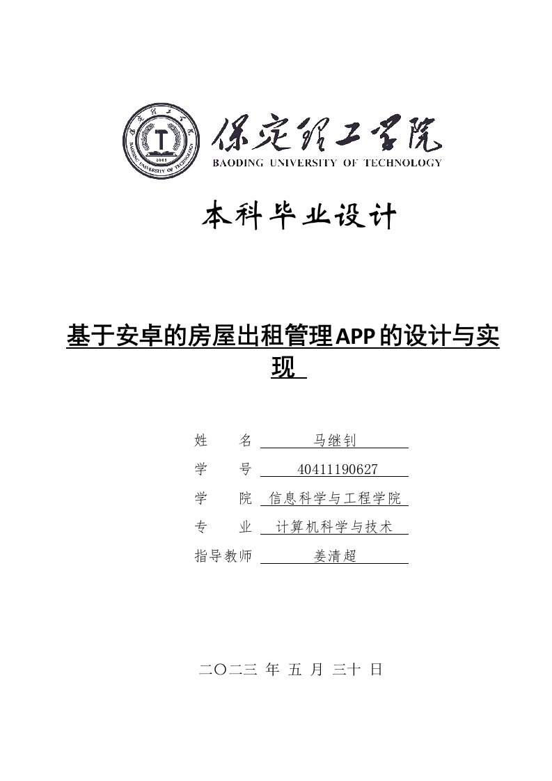 BAODING UNIVERSITY OF TECHNOLOGY本科毕业设计基于安卓的房屋出租管理APP的设计与实现姓名马继钊学号40411190627学院信息科学与工程学院专业计算机科学与技术指导教师姜清超二O二三年五月三十日学位论文原创性声明本人所提交的学位论文是在指导教师指导下所取得的原创性成果。除文中已经注明引用的内容外,本论文未剽窃、抄袭他人的学术观点、思想和成果,未篡改研究数据。如有违规行为发生,本人愿承担一切责任,接受学校处理。本声明的法律后果由本人承担。论文作者(签名):2023年5月30日2023年5月30日学位论文版权使用授权书本学位论文作者完全了解保定理工学院有权保留并向国家有关部门或机构送交学位论文的复印件和磁盘,允许论文被查阅和借阅。本人授权保定理工学院可以将学位论文的全部或部分内容编入有关数据库进行检索,可以采用影印、缩印或其它复制手段保存、汇编学位论文。保密的学位论文在解密后适用本授权书。论文作者(签名):马继制2023年5月30日2023年5月30日摘要随着互联网的发展,越来越多的租房者选择线上租房,房屋出租问题也被搬上了互联网平台,为了更好地管理合同、租金等住房管理问题,以及承租人更容易了解住房出租情况,设计一个房屋出租系统是很有意义的。采用了Java语言,MySQL数据库存储数据,为用户提供了一个界面友好的房屋出租台。系统主要实现了:房源信息管理、租金管理、客户信息管理、租房管理、地区位置管理、留言板管理、信息统计、房源推荐等功能。在系统开发完成后,利用黑盒测试对系统平台进行测试,确保该系统是一个各项功能都能够正常运行、性能良好的房屋租赁平台。实现了租赁信息的在线发布,基本满足了租赁双方的基本需求,使得租赁房屋变得更加信息化、简洁化。关键词:房屋出租管理;Java语言;MySQL数据库;SSM框架