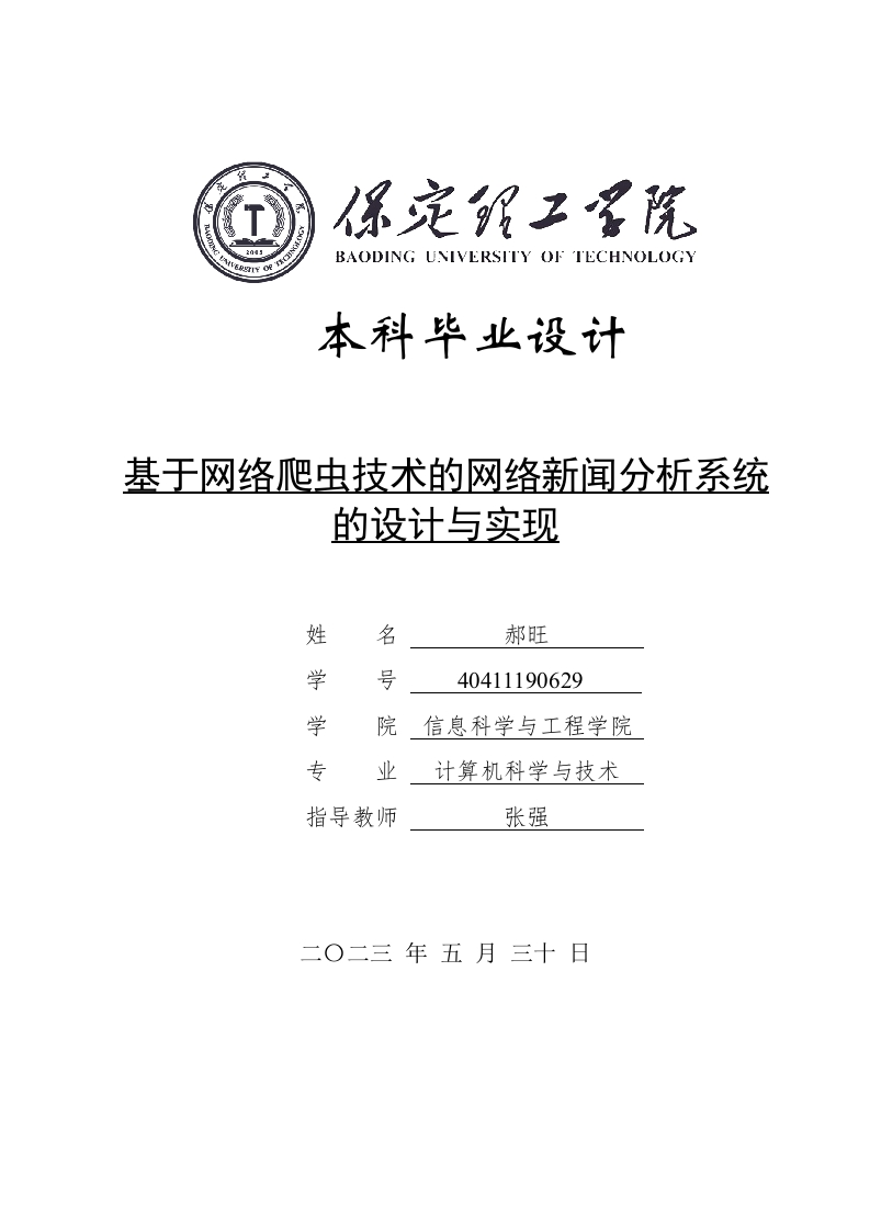 BAODING UNIVERSITY OF TECHNOLOGY本科毕业设计基于网络爬虫技术的网络新闻分析系统的设计与实现姓名郝旺学号40411190629学院信息科学与工程学院专业计算机科学与技术指导教师张强二O二三年五月三十日学位论文原创性声明本人所提交的学位论文是在指导教师指导下所取得的原创性成果。除文中己经注明引用的内容外,本论文未剽窃、抄袭他人的学术观点、思想和成果,未篡改研究数据。如有违规行为发生,本人愿承担一切责任,接受学校处理。本声明的法律后果由本人承担。论文作者(签名):2023年5月30日2023年5月30日学位论文版权使用授权书本学位论文作者完全了解保定理工学院有权保留并向国家有关部门或机构送交学位论文的复印件和磁盘,允许论文被查阅和借阅。本人授权保定理工学院可以将学位论文的全部或部分内容编入有关数据库进行检索,可以采用影印、缩印或其它复制手段保存、汇编学位论文。保密的学位论文在解密后适用本授权书。论文作者(签名):指导教师(签名):张强2023年5月30日2023年5月30日摘要随着网络技术的进步,“信息过载”这个问题逐渐显露出来,不管是信息的传递者还是接受者,都应该正视这个现象,并想办法去避免。在信息接受者的角度上来讲,应该重视如何去高效地获取自己需要的资讯这一现象。基于上述问题,大数据分析成为了计算机领域的一个工作重点。本课题是通过Java语言来设计基于网络爬虫技术的网络新闻分析系统,这是一个可以部署到支持多人系统操作的本地系统。很多网站都隐藏了实际地址,所以无法通过显示地址栏地址或解析HTML文本来获取实际地址。此系统通过对网络爬虫相关技术进行深入研究,以实现基于内容搜索引擎的目的,通过分析服务器与本地网卡之间的网络交换分组,来获取下载地址的方法并利用JSP技术构建网页,再通过ECharts工具进行可视化展示,设计出基于网络爬虫技术的网络新闻分析系统。关键词:新闻数据:ECharts;网络爬虫;Java语言