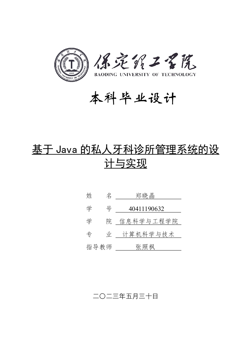 BAODING UNIVERSITY OF TECHNOLOGY本科毕业设计基于Java的私人牙科诊所管理系统的设计与实现姓名郑晓晶学号40411190632学院信息科学与工程学院专业计算机科学与技术指导教师张照枫二O二三年五月三十日学位论文原创性声明本人所提交的学位论文是在指导教师指导下所取得的原创性成果。除文中已经注明引用的内容外,本论文未剽窃、抄袭他人的学术观点、思想和成果,未篡改研究数据。如有违规行为发生,本人愿承担一切责任,接受学校处理。本声明的法律后果由本人承担。2023年5月30日2023年5月30日学位论文版权使用授权书本学位论文作者完全了解保定理工学院有权保留并向国家有关部门或机构送交学位论文的复印件和磁盘,允许论文被查阅和借阅。本人授权保定理工学院可以将学位论文的全部或部分内容编入有关数据库进行检索,可以采用影印、缩印或其它复制手段保存、汇编学位论文。保密的学位论文在解密后适用本授权书。2023年5月30日2023年5月30日摘要随着计算机网络的快速发展,越来越多的工作都可以通过计算机来完成,这样不但可以提高人们的工作效率,还可以保证数据的完整性和信息的存储性。目前私人牙科诊所管理的业务非常多,只靠人工管理效率很低,所以急需开发一个私人牙科诊所管理系统来对牙科诊所进行信息化管理。系统采用SSM架构、Java语言和Ajax技术来进行业务系统的编码及其开发,使用ySQL作为数据库,实现了私人牙科诊所管理系统。系统实现的功能模块有:用户信息管理模块、药品管理模块、医嘱信息管理、病历信息管理、病历导出模块、公告信息管理、统计病症率信息管理、预约信息管理等。最后,对私人牙科诊所管理系统进行了测试,测试结果表明,系统界面美观,功能完善,方便了用户的使用。关键词:牙科诊所:Java语言:SSM框架:MySQL数据库I