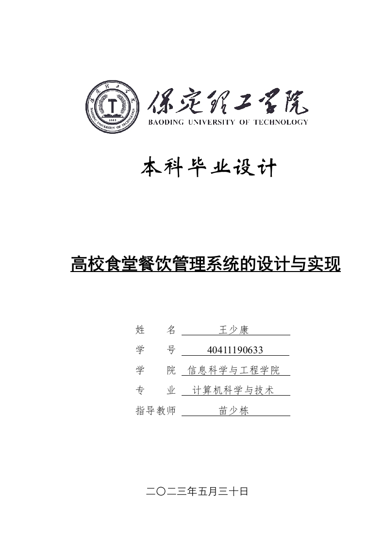 BAODING UNIVERSITY OF TECHNOLOGY本科毕业设计高校食堂餐饮管理系统的设计与实现姓名王少康学40411190633学院信息科学与工程学院专业计算机科学与技术指导教师苗少栋二O二三年五月三十日学位论文原创性声明本人所提交的学位论文是在指导教师指导下所取得的原创性成果。除文中己经注明引用的内容外,本论文未剽窃、抄袭他人的学术观点、思想和成果,未篡改研究数据。如有违规行为发生,本人愿承担一切责任,接受学校处理。本声明的法律后果由本人承担。论文作者(签名):指导教师确认(签名):2023年5月30日2023年5月30日学位论文版权使用授权书本学位论文作者完全了解保定理工学院有权保留并向国家有关部门或机构送交学位论文的复印件和磁盘,允许论文被查阅和借阅。本人授权保定理工学院可以将学位论文的全部或部分内容编入有关数据库进行检索,可以采用影印、缩印或其它复制手段保存、汇编学位论文。保密的学位论文在解密后适用本授权书。指导教师(签名):2023年5月30日2023年5月30日摘要随着校园规模的不断扩大和学生数量的增加,食堂的管理已成为学校管理的重要组成部分。当前许多学校的食堂管理模式相对落后。传统餐厅后勤管理混乱,食材品质参差不齐,各家商户,在食用油,盐等生产必须品上以次充好,给学生的饮食安全埋下了很大的隐患。还有对商家摊位费收费不均等一系列其他的问题,因此开发一个高校食堂餐饮管理系统尤为重要。采用Java语言、Spring Boot框架、MWC模型、IDEA平台、MySQL数据库等技术设计并实现了高校食堂餐饮管理系统,系统有商户管理、摊位管理、租赁管理、食材类别管理、食材信息管理、采购管理、评价管理等功能。经过测试系统运转正常,基本符合预期,使食堂管理更透明、运作更高效、整体更科学。关键词:MySQL数据库;Java语言;MWC模式:餐饮;管理系统