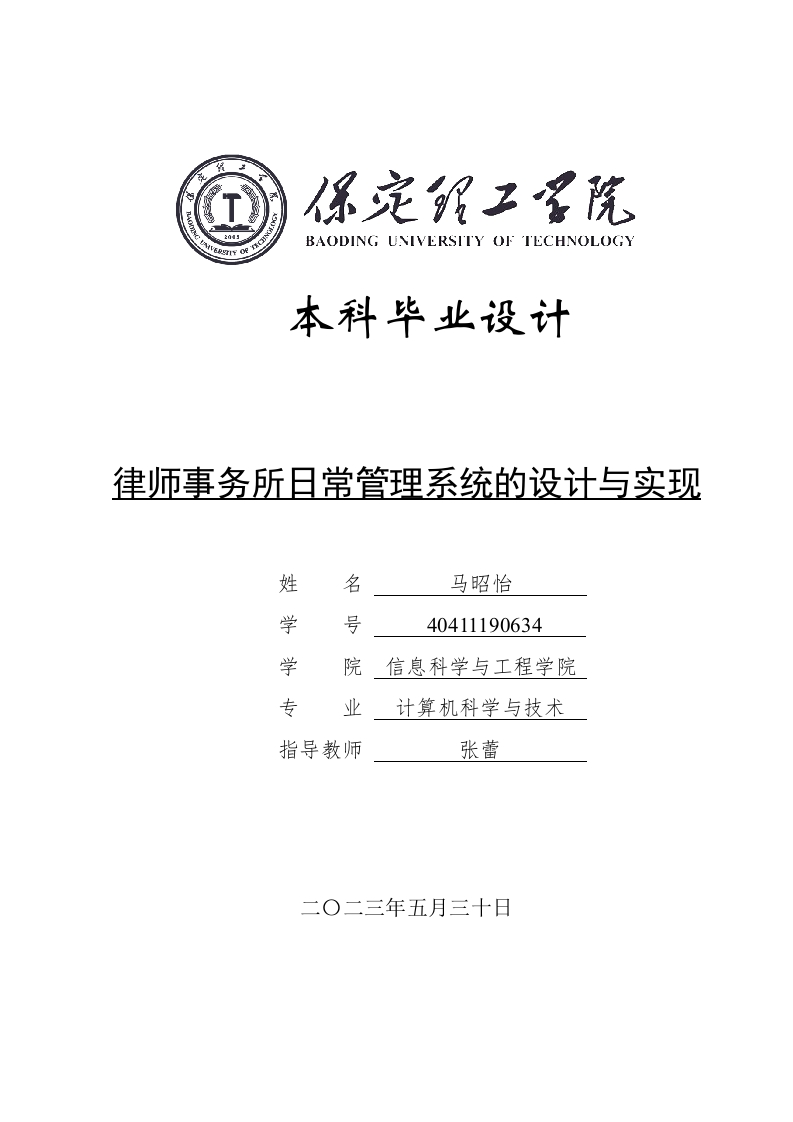 BAODING UNIVERSITY OF TECHNOLOGY本科毕业设计律师事务所日常管理系统的设计与实现姓名马昭怡学号40411190634学院信息科学与工程学院专业计算机科学与技术指导教师张蕾二O二三年五月三十日学位论文原创性声明本人所提交的学位论文是在指导教师指导下所取得的原创性成果。除文中已经注明引用的内容外,本论文未剽窃、抄袭他人的学术观点、思想和成果,未篡改研究数据。如有违规行为发生,本人愿承担一切责任,接受学校处理。本声明的法律后果由本人承担。论文作者(签名):指导教师确认(签名):2023年5月30日2023年5月30日学位论文版权使用授权书本学位论文作者完全了解保定理工学院有权保留并向国家有关部门或机构送交学位论文的复印件和磁盘,允许论文被查阅和借阅。本人授权保定理工学院可以将学位论文的全部或部分内容编入有关数据库进行检索,可以采用影印、缩印或其它复制手段保存、汇编学位论文。保密的学位论文在解密后适用本授权书。2023年5月30日2023年5月30日摘要伴随着人们生活条件的提高,人与人之间的矛盾也随之增多。近年来,各级人民法院审结的各类案件逐年增多,而法律工作者的任务也越来越重,律师事务所管理平台应运而生。基于SpringBoot框架,前端技术使用Vue框架,采用Java开发语言,MySQL数据库等技术开发了律师事务所日常管理系统,主要实现了个人中心、用户管理、律师类型管理、律师信息管理、案件信息管理、咨询记录管理、预约记录管理等功能。通过对系统各项功能的测试,表现为本软件运行良好,易于使用。关键词:律师事务所;Java语言;SpringBoot框架;Vue框架;MySQL数据库