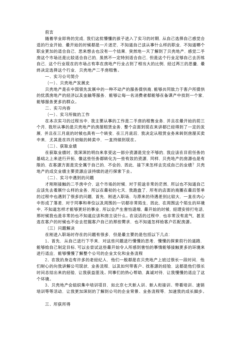 前言随着学业即将的完成,我们这批懵懂的孩子进入了实习的时期,从自己选择自己感觉合适的行业开始,最开始的时候都是一片迷茫,不知道自己该从事什么样的职业,不知道哪个职业更加的适合自己,思来想去也没有一个结果,突然地一天了解到了贝壳地产,感觉二手房这个市场还是比较适合自己的,虽然不一定特别适合自己,但是这个行业足够自己去历练自己,这个行业现在的市场占有率在房地产行业占到了相当大的比例,经过再三的思量,最终决定选择这个行业,贝壳地产二手房租售。一、实习公司简介(一)、贝壳地产发展史贝壳地产是在中国领先发展中的一种不动产的服务提供商,能够共同致力于客户所提供的优质房地产的经济以及金融等服务,能够让每一名消费者都能够在备课产中找到一个家,能够服务更多的群众。二、实习内容(一)、实习所做的工作在本次实习的过程当中,我主要从事的工作是二手房的租售业务,并且在最开始的前三个月,我所从事的是贝壳地产的房屋租赁业务,整个店面到现在来讲都已经得到了一定的发展,并且在三月底的时候也具有一个转变,在三月底后,我决定从租赁业务来转到房屋买卖中来,尤其是在四月初做的转卖中,一直持续到现在。(二)、获取业绩在获取业绩时,我深深的明白来享受这一部分资源是完全不够的,我应该在目前任务的基础之上来进行开拓,像这些任务都转化为一些有效的资源,同样,贝壳地产的房源也是有限的,在客源方面是完全属于自己的,不会的,因此,接下来怎样去完成自己的业绩?贝壳地产的成交业绩主要资源应该持续的进行探索下去。(二)、实习中遇到的问题才刚刚接触的二手房中介,这个市场的时候,对于前途非常的茫然,所以也不知道自己应该先去看展什么样的业务,所以在最初的七天,我跑盘了,所有的店面的商圈在最后签单的过程中也遇到了很多的问题,首先,刚进入职场,与原来的待遇差别比较大,一直在内心中形成了落差,对于同事和单位以及周围的一切都非常陌生,因此,在周围这个陌生的环境中,不知道怎样才能够更好的事业,所以会产生害怕退缩,最开始的时候,经理安排打电话,那时候我也是非常的也不知道应该和房主说什么。在说话的过程中,也非常没有底气,甚至连在客户的时候也不会去挖掘客户自己的那些斋求,也不知道怎样给客户匹配房源。(三)问题解决在刚进入职场时存在的问题有很多,但是最主要的是包括以下几点:1、首先,从自己进行下手来,对这些问题进行慢慢的思考,慢慢的探索前行的道路,能够给自己制定目标,可以去尝试这些最开始令人所感到害怕的事情能够接触更多的环境来进行适应,能够慢慢了解整个公司的企业文化和业务流程2、在我的身边有许多的老经纪人,他们一般都是在贝壳地产上班过很长一段时间,他们耐心的向我讲解公司现状,业务流程,以及如何带客户、找客源的经验,这都是他们很长时间总结出来的经验,让我获益匪浅。同事们的热心帮助,真诚对待,让我慢慢的适应了这个环境。3、贝壳地产会组织集中培训项目,如北京七天新人训、新人衔接训、带看培训、速销培训等等活动,让我更加深刻的了解到公司的企业背景、业务流程等,加速我的成长脚步。三、所获所得在贝壳的短短半年的时间中,经历了折单的无奈,经历了成单的喜悦、经历了纠纷的解决,在这半年的时间中,渐渐发现自己已不再是学校那个懵懂的小孩,渐渐的发现自己渐渐成熟了,不再那么幼稚,收起自己的腼腆,慢慢学会了稳重,慢慢懂得如何去好好与人的沟通以及相处,慢慢明白团队的重要性,慢慢了解生活的不容易。自己真的长大了,不再是那个成天沉浸在幻想中的、享受在父母羽翼下的孩子,学会了担当,知道了自己身上的责任,我在努力,我在奋斗,我为自己加油。