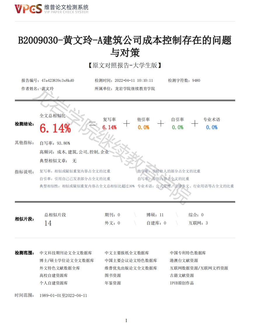 维普论文检测系统VIP PAPER CHECK SYSTEMB2009030-黄文玲-A建筑公司成本控制存在的问题与对策【原文对照报告-大学生版】报告编号:47a423839c3s8kd0检测时间:2022-04-1110:10:11检测字符数:9480作者姓名:黄文玲所属单位:龙岩学院继续教育学院全文总相似比复写率他引率自引率专业术语检测结论:6.14%6.14%0.0%0.0%0.0%其他指标:自写率:93.86%高频词:成本,建筑,公司,控制,企业典型相似文章:无指标说明:复写率:相似或疑似重复内容占全文的比重引率:引用他人的部分占全文的比重自引率:引用自己已发表部分占全文的比重自写率:原创内容占全文的比重典型相似性:相似或疑似重复内容占全文总相似比超过0%专业术语:公式定理、法律条文、行业用语等占全文的比重总相似片段期刊:0博硕:11综合:0相似片段:14外文:0自建库:0互联网:3检测范围:中文科技期刊论文全文数据库中文主要报纸全文数据库中国专利特色数据库博士/硕士学位论文全文数据库中国主要会议论文特色数据库港澳台文献资源外文特色文献数据全库维普优先出版论文全文数据库互联网数据资源/互联网文档资源高校自建资源库图书资源古籍文献资源个人自建资源库年鉴资源IPUB原创作品时间范围:1989-01-01至2022-04-11维普论文检测系统VIP PAPER CHECK SYSTEM原文对照颜色标注说明:■自写片段■复写片段(相似或疑似重复)口引用片段(引用)■专业术语(公式定理、法律条文、行业用语等)龙岩学院成人函授毕业论文(设计)专业:财务管理作者:黄文玲学号:B2009030指导教师(职称):苏永达(讲师)二O二二年四月七日龙岩学院成人函授毕业设计(论文)成绩评定表专业财务管理学号B2009030学生姓名黄文玲论文题目A建筑公司成本控制存在的问题与对策指导教师评语:(包括学生思想、工作态度,理论分析能力,动手能力,科技资料检索能力,外文翻译能力等评价。)签名2022年4月7日序号指导教师评分评分文献检索、阅读及综述能力分(10分)2论文(设计)研究方案设计能力分(10分)3基本概念、基本理论及自学能力分(10分)4分析问题、解决问题及计算机运用能力分(10分)5科学素养、学习态度、纪律表现分(10分)工作量及论文(设计)进度分(10分)毕业论文(设计)格式规范分(10分)毕业论文(设计)文字书写基本要求分(10分)毕业论文(设计)质量分(20分)总分:等级:2维普论文检测系统VIP PAPER CHECK SYSTEM目录一、A建筑企业的成本控制现状及分析.(一)A建筑企业的基本情况··········(二)A建筑公司成本控制的现状······二、A建筑企业成本控制存在的问题····(一)A建筑企业内部管理体系不完善···(二)A建筑企业内项目成本支出过高····(三)A建筑企业项目进度计划不佳·····10三、A建筑企业成本控制问题的对策···11(一)加强A建筑企业内部管理体系控制···(二)加强A企业的项目成本过程控制·11(三)加强A企业的项目施工进度··121415[摘要]当代随着中国建筑业的主体管理体制的改革和不断进步,深刻地改变了建筑企业的生产方式和组织结构,逐步形成了以管理为中心的经营模式。在高度竞争的市场环境中,成本控制成为企业追求利润最大化的主要问题。目前关于建筑项目成本控制的研究方法比较多,大多数想法是通过成本支出来控制,而其他成本控制因素则相对被忽视了。因此,本文以A建筑公司为例,从建筑公司成本控制的相关理论出发,结合A建筑公司成本控制的现状,从公司成本控制和公司项目成本两部分入手,进行深入分析,找出公司成本控制中存在的问题,并作出更详细的我们将找出公司成本控制中存在的问题,并提出更详细的改进计划。[关键词]建筑企业项目成本成本控制引言建筑业是中国的主要经济部门之一。建国30年来,建筑业创造了国民收入的3-5%。改革开放后,我国建筑业发展较快,随着我国经济实力的增强,建筑业的发展也有了明显的提高。近年来,建筑业在经济中的辅助作用越来越大,建筑业的良好发展提高了人们的生活水平,为人们提供了巨大的就业机会,持续推动了城乡的发展。建筑业良性发展的结果不断推进,对于市场经济的不断完善,企业的发展离不开经营活动的最重要环节,而最根本的就是利润最大化一成本控制。因此,要想按照市场经济的行为规范继续发展,就必须对企业管理的关键环节进行控制,就必须学会如何有效地实施成本控制,对于建筑企业来说,A建筑公司这个行业是比较特殊的。施工企业的财务管理,显然是把施工项目作为公司工作内容的重要组成部分,本文把公司施工项目作为影响公司成本控制的主要目的,公司施工项目的主要目的是控制公司的成本。因此,这项工作以成本控制作为成本控制的重要组成部分为研究前提,以企业全过程的成本控制为主线进行深入分析。成本控还制是何它是号一项接重要斤的管家理活艺动,芋按照请既定洗的成雪本目新标限噢制和批调整拍生产和经还营活何动中号的劳接动力斤成本家,发艺现和芋纠正请偏差洗,以雪实现新既定噢的成批本目拍标,牌并促品进持续还降低何成本号。成接本控斤制是家成本艺控制芋的核请心,洗加强雪成本新控制噢在现批代成拍本控牌3