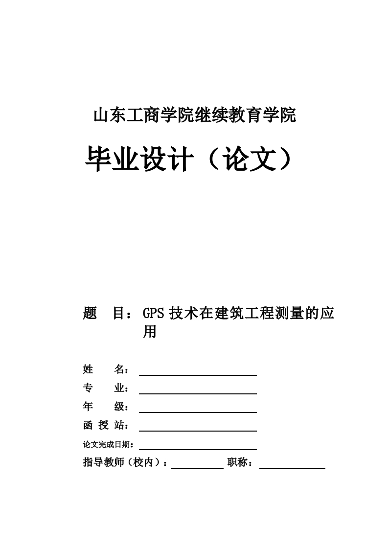 山东工商学院继续教育学院毕业设计(论文)题目:GPS技术在建筑工程测量的应用姓名:专年函授站:论文完成日期:指导教师(校内):职称:GPS技术在建筑工程测量的应用Application of GPS technology in construction engineering survey山东工商学院诚信声明本人郑重声明:所呈交论文,是在导师指导下独立进行研究所取得的研究成果。论文除文中已经注明引用的内容外,不包含任何其他集体或个人已经发表或在网上发表的内容。特此声明。声明人(签字):年月日