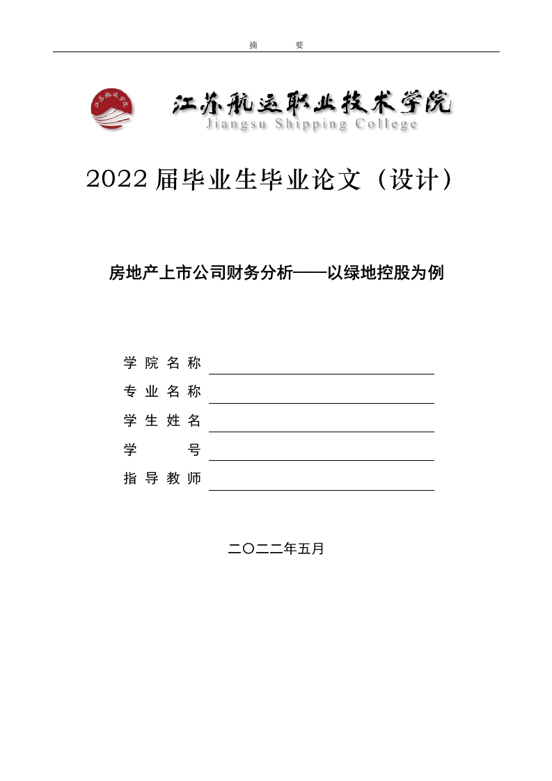 摘要Jiangsu Shipping College2022届毕业生毕业论文(设计)房地产上市公司财务分析一以绿地控股为例学院名称专业名称学生姓名学号指导教师二O二二年五月摘要摘要最近几年社会经济的不断向前发展,房地产行业也呈现出一片欣欣向荣的发展态势,逐渐在国民经济中占据更高的地位,且越来越重视企业的经济效益与财务状况,财务分析在企业发展过程中的作用也越来越明显。财务分析即利用相关财务指标对企业资金情况和生产经营情况进行分析,并评估其经营绩效。本文以绿地控股为例,从上市公司的角度考虑,将相关的理论介绍到应用的现状分析。首先介绍了财务报表的含义、用途,接着将财务报表分析所使的用方法引出来,本文利用比率分析方法、比较分析法对绿地控股的财务报表进行分析,最后根据数据分析得出了相应的结论,并对绿地控股存在的问题提出了合理的解决措施。关键词:房地产行业,绿地控股,财务分析目录摘要21绪论31.1研究背景1.2研究意义1.2.1理论意义31.2.2现实意义2财务分析的概念及方法42.1财务分析的概念。42.2财务分析的方法42.2.1文献研究法..42.2.2案例分析法52.2.3比较分析法53绿地控股集团概况及财务分析53.1绿地控股集团公司概况3.2绿地控股财务指标分析53.2.1偿债能力分析.53.2.2营运能力分析..63.2.3盈利能力分析.73.2.4发展能力分析3.3绿地控股财务报表分析。。93.3.1资产负债表分析.....103.3.3现金流量表分析...103.4绿地控股与同行业的对比分析114绿地控股财务分析评价及建议124.1绿地控股财务分析结果评价..124.1.1应收账款周转率低....4.1.2存货周转率低.·124.1.3负债率高,偿债能力弱12134.21应收账款的管理政策..…134.2.2存货周转管理政策....134.2.3有效降低成本,降低负债风险..1316