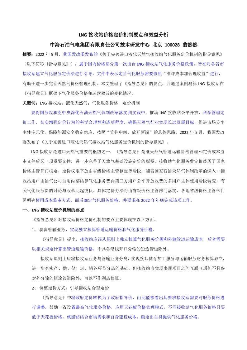 NG接收站价格定价机制要点和效益分析中海石油气电集团有限责任公司技术研发中心北京100028翁然然摘要:2022年5月,我国发改委发布的《关于完善进口液化天然气接收站气化服务定价机制的指导意见》(以下简称《指导意见》),属于国内价格部分第一次出台NG接收站气化服务价格政策,旨在对各省市接收站建立气化服务定价法进行引导,文件中表示定价气化服务需要依照“准许成本加合理收益”进行,有助于进一步完善天然气价格管理机制。本文整理了《指导意见》的要点,并通过案例测算NG接收站在《指导意见》框架下气化服务价格和运营效益的变化情况。关键词:NG接收站:液化天然气:气化服务价格:定价机制要将国务院和党中央深化石油天然气体制改革落实到实践中,推动NG接收站公平开放,科学管理定价工作,切实增强定价行为的科学合理性和透明程度,确保天然气行业实现长远发展目标,促进市场竞争主体多元化,保障能源安全稳定供应,按照“管住中间,放开两端”的总体思路,2022年5月,我国发改委发布了《关于完善进口液化天然气接收站气化服务定价机制的指导意见》。NG接收站是进口天然气重要的枢纽之一,《指导意见》是继天然气管道运输价格管理和定价成本监审文件后又一项重要文件,进一步完善了天然气基础设施定价的版图。接收站气化服务费定价经历了国家价格主管部门核定、定价权限下放由省级价格主管核定等阶段,随着国家石油天然气体制改革的深入,接收站用户由油气公司自用内部结算气化服务费向第三方用户公平开放收费的多用户主体使用阶段转变,有关气化服务费的讨论与改革此起彼伏。具体定价办法将由省级价格主管部门落实,各地省级价格主管部门需明确使用成本监审方式,而后确定气化服务价格,并要求在2022年年底完成该项工作。一、NG接收站定价机制的要点《指导意见》对接收站价格定价机制的要点主要体现在以下方面。1、剥离管输业务,实现独立核算管道运输价格和气化服务价格。《指导意见》提出,接收站应该从原则上独立核算气化服务价额和外输管道运输成本,后者需要以相关规定计算出管道运输价格,不具备沿线开口分输的短途管道除外。接收站原则上应将接收站业务与管输业务分离,实现接卸储存加工服务与运输服务财务核算独立,进一步夯实产、供、储、运、销各环节分离的基础。但接收站内实现多期项目之间互联互通但不具备对外分输的短途管道除外,可以不作剥离核算。2、调整定价方式,引导接收站合理定价《指导意见》中将政府定价转换为了政府指导价,由此能够看出其要求接收站需要对服务价格进行调整,鼓励一省设置最高气化服务价格,应用天花板价格管理模式。不同接收站气化服务价格只要低于天花板价格,就能够结合市场需求和自身建设成本,确定出自身提供气化服务价格。接收站气化服务价格调整为政府指导价,由一站一价调整为一站一最高气化服务价格,而在此基础上实现一省一最高气化服务价格。应用天花板价格模式之后,能够避免出现接收站过高收取气化服务价格现象,接收站公司在一定范围内拥有自主定价权,气化服务价格实现价格动态性和弹性,有利于市场发挥资源配置调节、价格杠杆调节供需的正向作用。一省一天花板气化服务价格,树立标杆价格,引导省内各接收站合理、透明和理性定价,实现区域市场内气化服务价格平均化,避免市场价格竞争乱象,有利于未来油气行业统一大市场形成。攻府定价攻府指导价一站一价一站一最高气化服务省一最高气化服务价格价格图1NG接收站气化服务价格演变过程一省一天花板气化服务价格制定,需统筹考虑省内接收站运营管理水平差异、接收站规模、接收站项目工程所处阶段以及省内各地天然气市场等因素,避免因各接收站差异因素导致的气化服务价格失真,与天然气市场消费端不匹配,进而对当地天然气市场发展造成影响,甚至出现沿海发达地区接收站较多的临近省份之间的价格差异竞争。3、确定定价方法,填补天然气产业“储”环节的定价空白《指导意见》发布前,接收站项目投资决策阶段通常采用经营期评价法测算气化服务价格。《指导意见》发布后,新建接收站投产运营初期,仍可参照可研报告核定临时价格即投资决策阶段通常采用的经营期评价法测算的价格:运营后期定最高气化服务价时,需要遵守“准许成本加合理收益”原则,对成本和准许收益进行核算并得出准许收入,再将其与气化量计算气化服务价格相除得出最终价格。LNG接收站气化服务定价机制投产运营初期投产运营后期新建接收站投产运营初期,可参照可研经按照“准许成本加合理收益方法,以监审营期评价法核定临时气化服务价格。核定的准许成本、准许收益核定气化服务价格。图2NG接收站气化服务价格定价方法准许成本和准许收益的计算,由省级价格主管部门通过成本监审方式确定。《指导意见》填补了天然气“储”环节的定价方法空白,与近些年国家发布的具有垄断属性的天然气管道采用的定价办法类似,统一了天然气“储”“运”环节的定价方法。·折旧及摊销费•运行维护费等准许收益·有效资产=固定资产净值+无形资产净值+营运资本·准许收益率8%税费·企业所得税·增值税附加等图3准许成本加合理收益方法构成要素4、细分定价名目,丰富