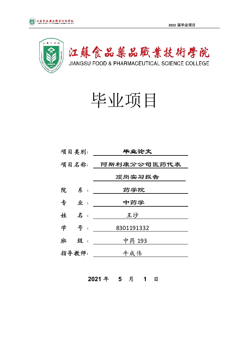 2022届毕业项目JIANGSU FOOD PHARMACEUTICAL SCIENCE COLLEGE毕业项目项目类别:华业论文项目名称:阿斯利康分公司医药代表顶岗实习报告院系药学院专业中药学姓名王沙学号8301191332班级:中药193指导教师:牛成伟2021年5月1日2022届毕业项目诚信声明本人郑重声明:所呈交的毕业项目报告/论文《阿斯利康分公司医药代表顶岗实习报告》是本人在指导老师的指导下,独立研究、写作的成果。论文中所引用是他人的无论以何种方式发布的文字、研究成果,均在论文中以明确方式标明。本声明的法律结果由本人独自承担。作者签名:王沙2022年5月1日2022届毕业项目摘要:我在阿斯利康进行了为期十个月的顶岗实习,主要从事于医药代表,在医药代表实习中我主要负责以下工作:一是拜访医生,药师和科室的医疗小组成员;二是给医院里的医生、护士、实习医生演讲。三是开展学术推广,协助企业或其他单位,为医生和医务人员组织会议:四是搭建关系,和医务科以及其他相关行政工作人员:五是竞品分析了解竞争对手的活动和产品市场占有率,药品铺开率等等。作为医药代表,我们面对的客户是医生,在销售医药产品时,必须要做到对自己所销售的产品了解颇深,还要结合医生的角度上考虑,寻找合适的销售技巧和手段,与他们进行交流沟通。本文结合自身实习情况,分析实习医药代表岗位中的个人体会,可以为之后自己毕业选择职业岗位提供一定的参考依据。