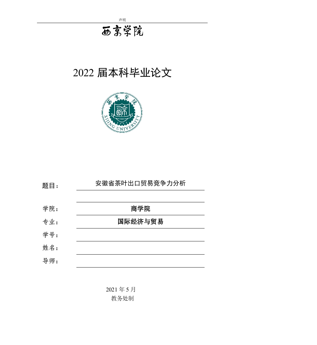 声明2022届本科毕业论文题目:安徽省茶叶出口贸易竞争力分析学院:商学院专业:国际经济与贸易学号:姓名:导师:2021年5月教务处制声明西京学院原创性声明本人郑重声明:本人所呈交的毕业设计(论文),是在导师的指导下独立进行研究所取得的成果。毕业设计(论文)中凡引用他人已经发表或未发表的成果、数据、观点等,均己明确注明出处。除文中已经注明引用的内容外,不包含任何其他个人或集体已经发表或在网上发表的论文。特此声明。论文作者签名:指导教师签名:日期:摘要摘要安徽作为我国的主要产茶地之一,茶树生长的历史也十分久远,是中国许多传统名优茶的源头地和优良产区,中国传统的名牌产品及优质产品茶还有黄山茅峰、六安瓜片、祁门红茶等。茶叶是安徽省对外出口的主要农作物,也是安徽省财政收入的主要经济来源之一。安徽茶叶不仅在国内饱受欢迎,还出口国外,引起了世界各地人民的喜爱与追捧。安徽省茶叶生产与出口有着诸多优势,包括资源优势、区位优势、政策与标准优势、原产地产品保护制度优势等。但是在茶叶出口中面临着茶叶加工卫生问题、原产地地域保护问题、市场开发问题以及国内茶叶对外出口竞争等问题。另外,在当前国际竞争日趋白热化的大环境下,国际市场上国际贸易环境变差,即国际贸易环境变化将降低茶叶的出口额,对安徽的茶叶出口产生负面影响,同时安徽企业的茶叶制造质量和国内外市场的供求情况,也会影响茶叶出口的情况。本论文以安徽茶叶出口贸易为背景,广泛阅读相关的资料,搜集相关数据,分析安徽省茶叶出口现状,研究安微茶叶出口中的优势与挑战,依据分析结果提出相应的对策和建议,以期为茶叶出口提供一定的借鉴作用,更好地解决当前安徽省茶叶出口面临的问题。关键字:安微省;茶叶出口;竞争力:SWOT分析