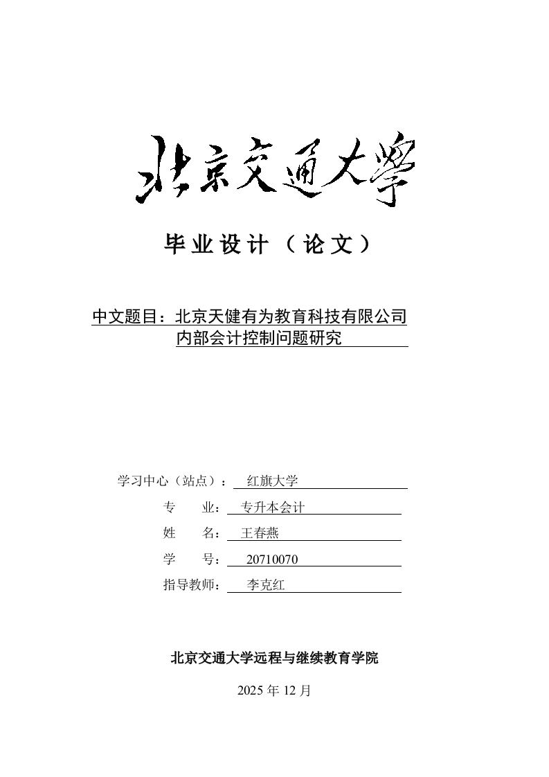 毕业设计(论文)中文题目:北京天健有为教育科技有限公司内部会计控制问题研究学习中心(站点):红旗大学专业:专升本会计姓名:王春燕学号:20710070指导教师:李克红北京交通大学远程与继续教育学院2025年12月毕业设计(论文)承诺书与版权使用授权书本人所呈交的毕业设计(论文)是本人在指导教师指导下独立研究、写作的成果。除了文中特别加以标注和致谢之处外,文中不包含其他人已经发表或撰写过的研究成果,也不包含为获得北京交通大学或其他教育机构的学位或证书而使用过的材料。与我一同工作的同志对本研究所做的任何贡献均已在文中作了明确的说明并表示了谢意。本毕业设计(论文)是本人在读期间所完成的学业的组成部分,同意学校将本毕业设计(论文)的部分或全部内容编入有关书籍、数据库保存,并向有关学术部门和国家相关教育主管部门呈交复印件、电子文档,允许采用复制、印刷等方式将本毕业设计(论文)文本提供给读者查阅和借阅。论文作者签名:王春燕2022年03月01日指导教师签名:2022_年_03_月_01日北京交通大学毕业设计(论文)成绩评议年级2020层次专升本专业会计学姓名王春燕题目北京天健有为教育科技有限公司内部会计控制问题研究王春燕同学的毕业论文题目符合会计专业的论文选题,在毕业论文写作过程中能够积极与指导老师沟通论文相关写作事宜,态度端正认真,基本能够理论联指系实际,基本掌握了本学科基础理论和专业知识,基本完成了毕业论文任务。论文在介绍相关理论内容的基础上,结合实际展开分析,给出一定建议。文师评章语言表达流畅,思路较清晰,内容较完整框架结构也安排得比较合理,论文的阅不足之处在于分析问题时的数据支撑还可进一步丰富和提升。见本文基本达到本科毕业论文要求。成绩评定:指导教师:李克红2022年1月30日答辩小组意见答辩小组负责人:年月日2