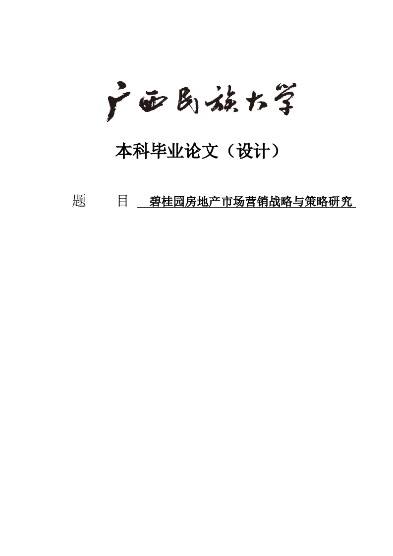 本科毕业论文(设计)题碧桂园房地产市场营销战略与策略研究目录Abstract ......(二)研究目的及意义二、房地产市场营销策略理论综述房地产市场营销的概念..(二)房地产市场营销的基本特征..(三)房地产市场营销的内容.2三、碧桂园营销环境分析...33(二)3四、碧桂园营销中存在的问题.…4(一)虚假承诺顾客,造成客户跳单现象明显4(二)4(三)5五、碧桂园营销策略构建..·5规避虚假承诺,强化品牌魅力5(二)建立组合营销推广机制...6六、结束语7参考文献…8致谢9
