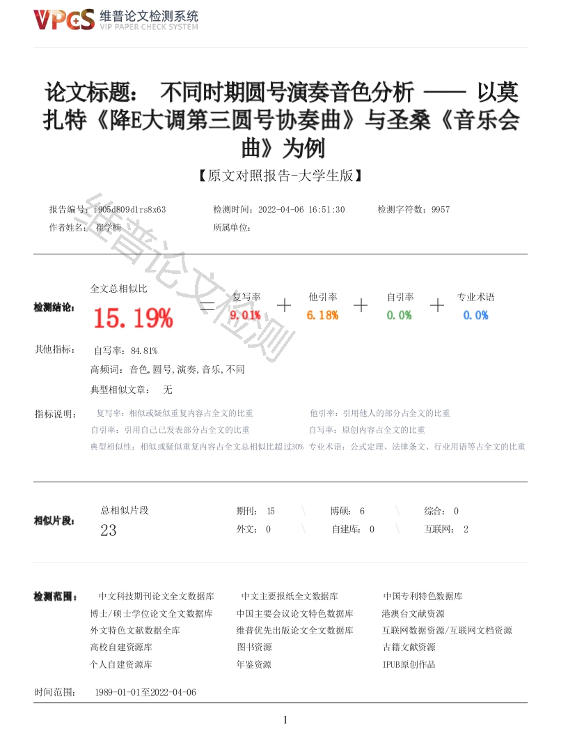 维普论文检测系统VIP PAPER CHECK SYSTEM论文标题:不同时期圆号演奏音色分析一以莫扎特《降E大调第三圆号协奏曲》与圣桑《音乐会曲》为例【原文对照报告-大学生版】报告编号:f905d809dlrs8x63检测时间:2022040616:51:30检测字符数:9957所属单位:全文总相似比复写率他引率自引率专业术语检测结论:15.19%9.01%6.18%0.0%0.0%其他指标:自写率:84.81%高频词:音色圆号,演奏,音乐,不同典型相似文章:无指标说明:复写率:相似或疑似重复内容占全文的比重他引率:引用他人的部分占全文的比重自引率:引用自己已发表部分占全文的比重自写率:原创内容占全文的比重典型相似性:相似或疑似重复内容占全文总相似比超过3%专业术语:公式定理、法律条文、行业用语等占全文的比重总相似片段期刑:15博硕:6综合:0相似片段:23外文:0自建库:0互联网:2检测范围:中文科技期刊论文全文数据库中文主要报纸全文数据库中因专利特色数据库博士/硕士学位论文全文数据库中国主要会议论文特色数据库港澳台文献资源外文特色文献数据全库维普优先出版论文全文数据库互联网数据资源/互联网文档资源高校自建资源库图书资源古籍文献资源个人自建资源库年鉴资源IPUB原创作品时间范围:1989-0101至202204061VPCS维普论文检测系统VIP PAPER CHECK SYSTEM颜色标注说明:■自写片段■复写片段(相似或疑似重复)·引用片段(用)■专业术语(公式定理、法律条文、行业用语等)本科生毕业论文(设计)题目:不同时期圆号演奏音色分析一以莫扎特《降E大调第三圆号协奏曲》与圣桑《音乐会曲》为例学生姓名:崔学楠指导教师:常江涛学院:音乐学院专业:音乐学年级:2018级完成日期:2022年月日学位论文原创性声明本人所提交的学位论文,是在导师的指导下,独立进行研究工作所取得的原创性成果。除文中已经注明引用的内容外,本论文不包含任何其他个人或集体己经发表或撰写过的研究成果。对本文的研究做出重要贡献的个人和集体,均己在文中标明。本声明的法律后果由本人承担。论文作者(签名):指导教师确认(签名):年月日年月日学位论文版权使用授权书己申请保密的论文须添加本句。本学位论文作者完全了解河北师范大学有权保留并向国家有关部门或机构送交学位论文的复印件和磁盘,允许论文被查阅和借阅。本人授权河北师范大学可以将学位论文的全部或部分内容编入有关数据库进行检索,可以采用影印、缩印或其它复制手段保存、汇编学位论文。保密的学位论文在年解密后适用本授权书论文作者(签名):指导教师(签名):年月日年月日摘要圆号一件铜管乐器,但其与小号、长号等铜管乐器对比来说,其音色在具备铜管乐器张力的同时还有木管乐器2VPGS维普论文检测系统VIP PAPER CHECK SYSTEM的柔美典雅,这是圆号音色特有的双重属性。那么圆号为什么具有这一特点具有重要研究意义。因而,本论文主要以莫扎特《降E大调第三圆号协奏曲》和圣桑《音乐会曲》两个作品为例,研究古典主义和浪漫主义时期圆号的构造、创作背景、演奏技法对音色的影响。古典主义时期为自然圆号,音色偏向响亮恢弘的铜管音色:到浪漫主义时期发明出活塞圆号,柔和含蓄的木管音色更加显现出来。现在两种音色具有同等的地位,圆号演奏者需要根据不同乐句的处理不断的转换音色,因而也对音色的练习与选择提出了一定的见解。关键词:圆号音色古典主义浪漫主义《降E大调第三圆号协奏曲》《圣桑音乐会曲》AbstractHorn is a brass instrument,but compared with trumpet,trombone and other brass instruments,itstimbre not only has the tension of brass instruments,but also has the softness and elegance ofwoodwind instruments,which is the unique dual attribute of horn timbre.So why the horn has thischaracteristic has important research significance.Therefore,this paper mainly takes Mozart's HornConcerto No.3 in E flat major and Saint Sang's Concerto as examples to study the influence of hornstructure,creative background and performance techniques on timbre in the period of classicism andromanticism.In the classical period,it was a natural horn,and the timbre was biased towards theloud and magnificent copper tube timbre:In the romantic period,it developed into a key horn,andthe soft and implicit timbre of the wooden tube became more apparent.Now the two timbres have thesame status.Horn performance needs to constantly change timbres according to the processing ofdifferent phrases.Therefore,some opinions on the practice and selection of the two timbres are putforward.Key words:Horn Timbre The period of classicism Romantic period Horn Concerto No.3 in E-flat major,K.447 MORCEAU DE CONCERT Charles Camille Saint-Saens目录一、圆号音色的影响因素与发展····(一)圆号音色的影响因素·······(二)圆号音色的发展3二、铜管音色分析一莫扎特《降E大调第三圆号协奏曲》(一)音色与创作背景5(二)音色与演奏技法········三、木管音色分析一圣桑《音乐会曲》8音色与创作背景·········(二)音色与演奏技法······四、圆号音色的练习与选择····10圆号音色练习······10(二)圆号音色选择11123